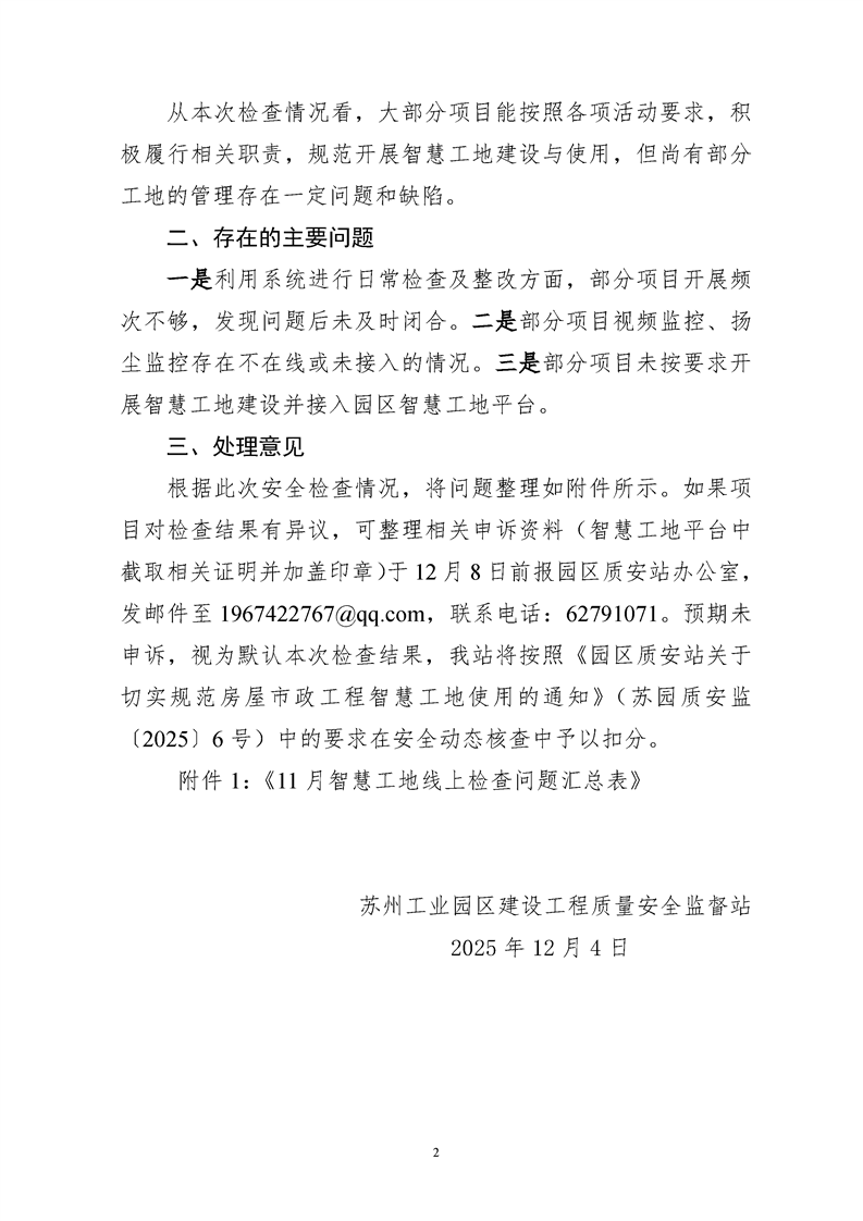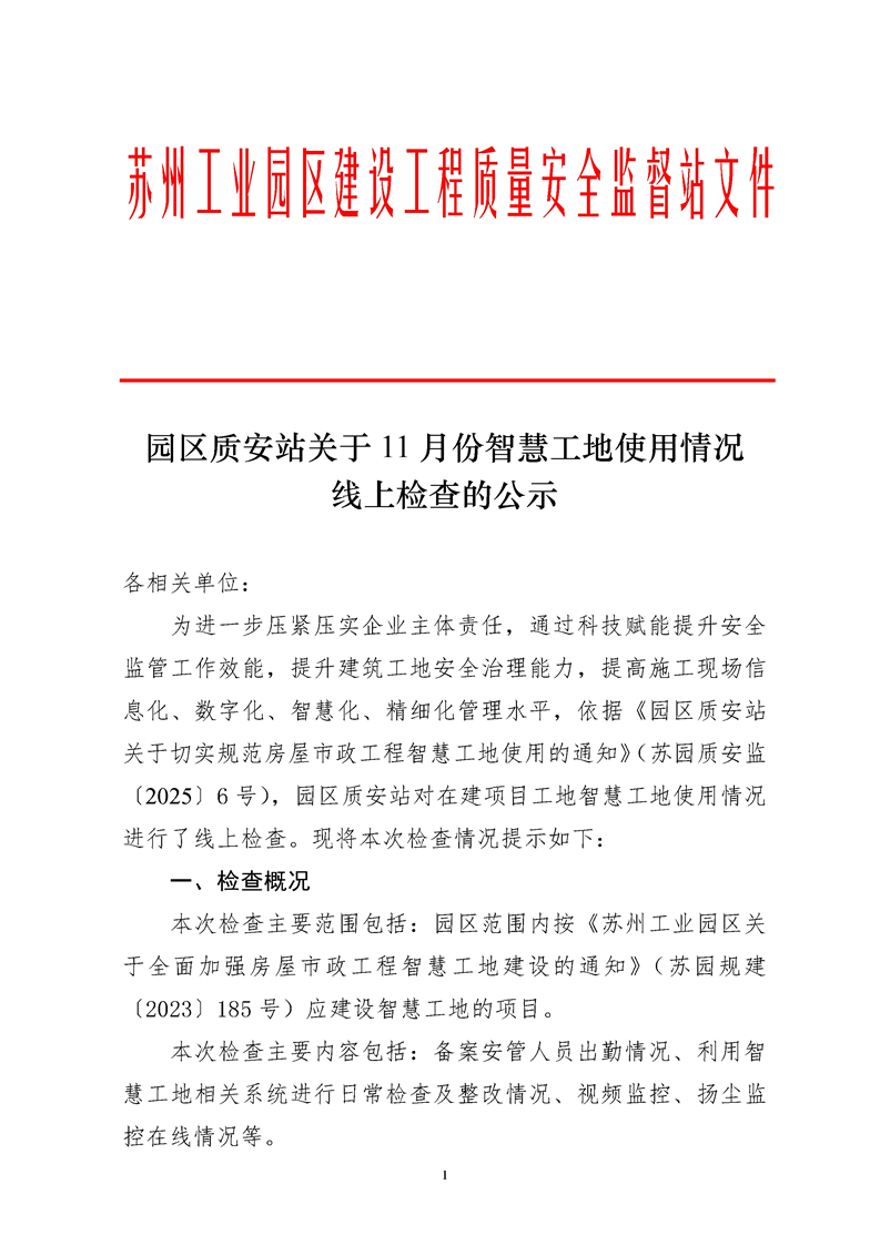 園區(qū)質(zhì)安站關(guān)于11月份智慧工地使用情況線上檢查的公示