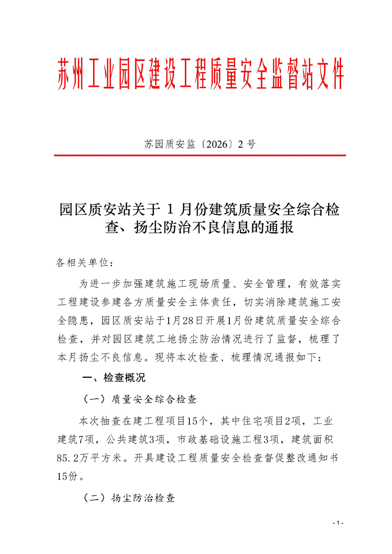 園區(qū)質(zhì)安站關(guān)于1月份建筑質(zhì)量安全綜合檢查、揚(yáng)塵防治不良信息的通報(bào)