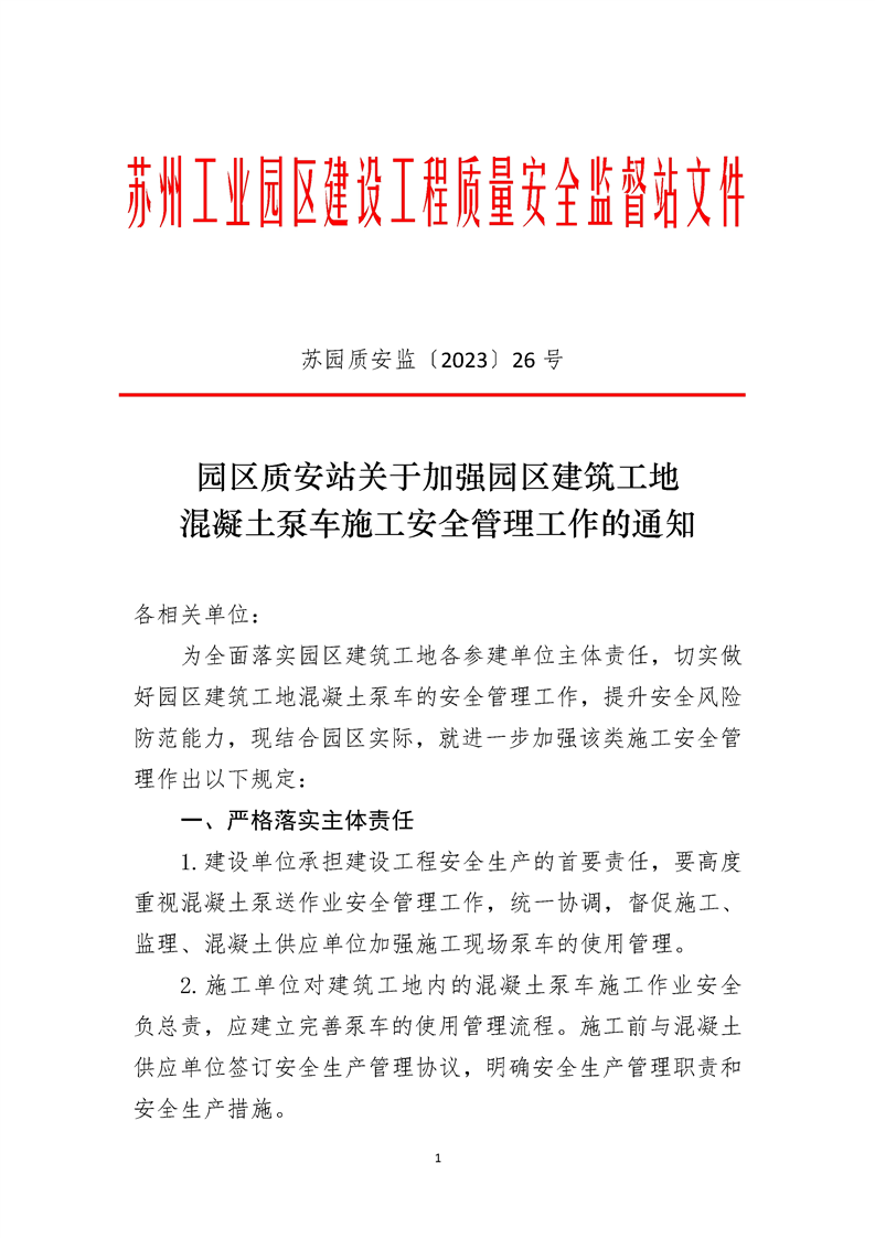 園區(qū)質(zhì)安站關(guān)于加強(qiáng)園區(qū)建筑工地混凝土泵車施工安全管理工作的通知