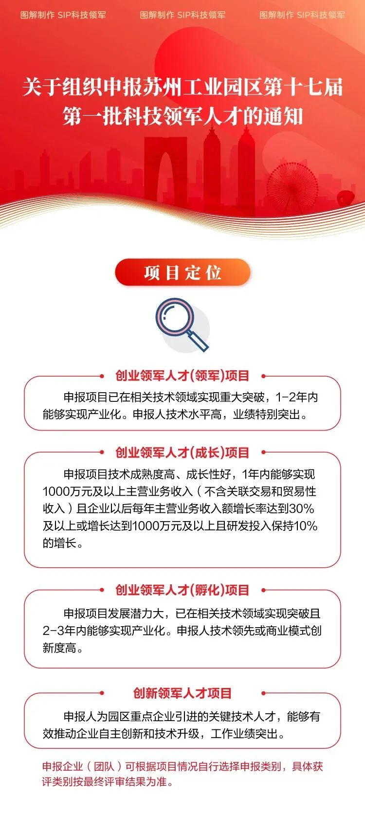 為加快推進開放創新的世界一流高科技園區建設,進一步加大高層次創新、創業領軍人才(團隊)引進力度,不斷提升園區創新源地、產業高地建設水平,現啟動第十七屆第一批園區科技領軍人才創新創業工程的申報工作。本屆科技領軍人才分兩批次集中受理評審,目前第一批正在申報。歡迎申報,載體請選擇:蘇州工業園區科技招商中心!