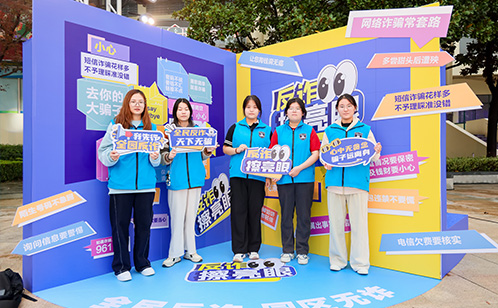 高校學生代表為到場觀眾帶來原創朗誦《反詐的交響》、原創反詐情景劇《我要投訴你》、原創反詐主題說唱歌曲《啊!我的錢》等演出作品,以行動詮釋反詐意識、展現陽光校園。