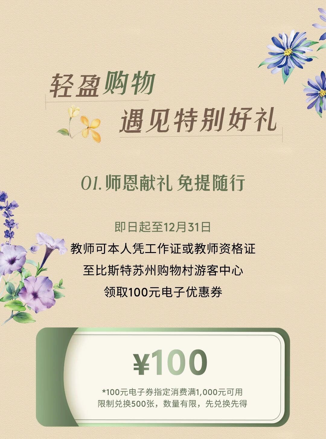 作為全球聞名的“比斯特系列”的一員,位于陽澄湖半島的比斯特蘇州購物村超200家品牌云集,是名副其實的購物天堂。即日起至12月31日,教師本人憑工作證或教師資格證,可到游客中心領取“滿1000元減100元現金禮券”,每人限領1張。此外,Timberland、MaxMara、Ferragamo等品牌推出尊享特賣,Adidas、Barbour、周大福等數十家品牌也陸續上線精選商品超低折扣、滿額折上折及贈禮活動,覆蓋服裝、鞋履、戶外等多個品類,為教師打造一站式購物優惠。