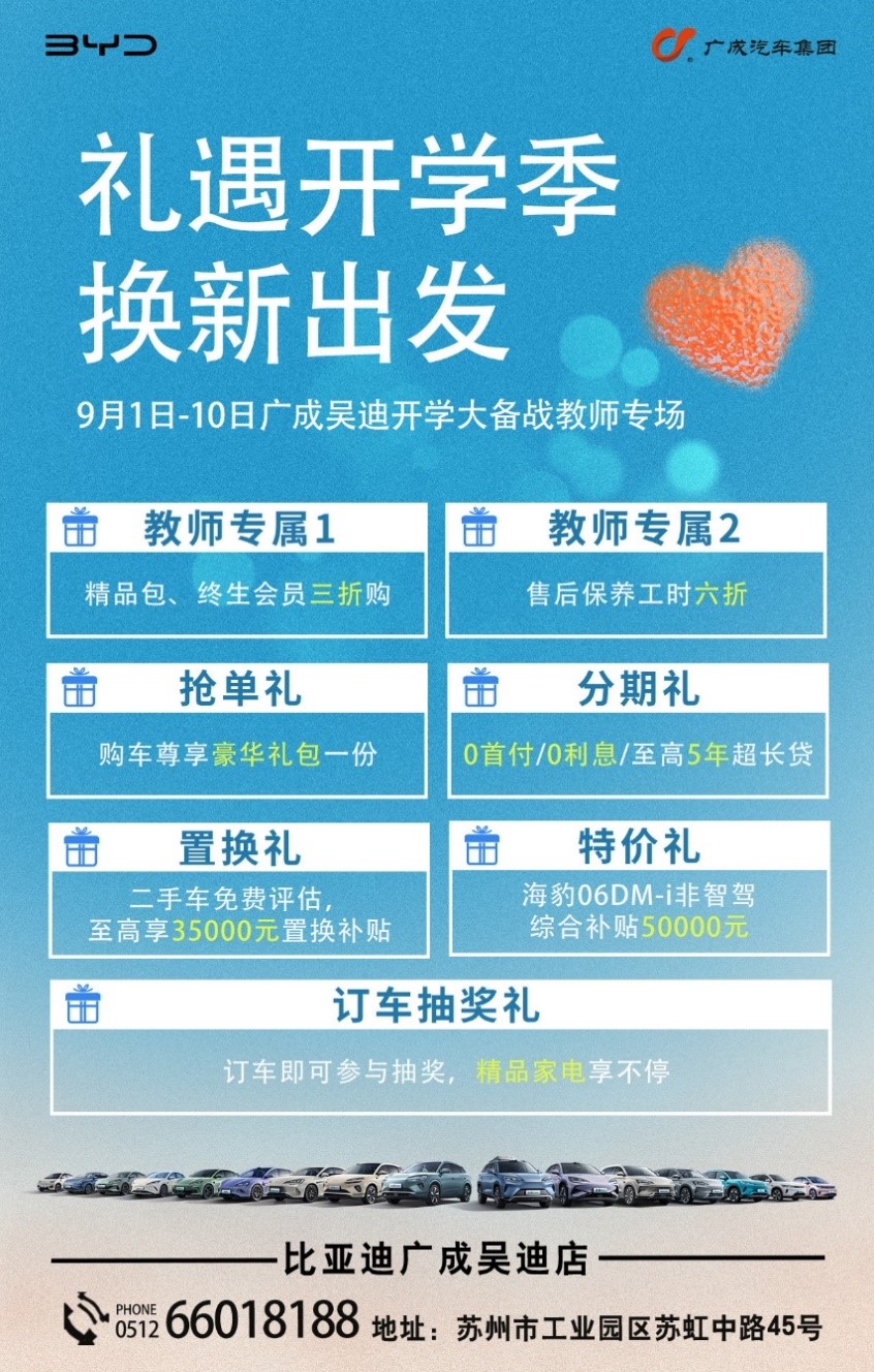 園區多家4S店推出購車特惠活動,讓教師們在這個特殊的節日里,實現優惠購車,享受出行的便捷與舒適。蘇州比亞迪廣成吳迪店推出教師專屬精品包、終生會員三折購、售后保養六折等活動,另有搶單禮、置換禮、抽獎禮等超值禮遇活動,海豹06DM-i非智駕綜合補貼高達50000元。奔馳蘇州中升之星、蘇州比亞迪盛世卓御汽車、蘇州中升雷克薩斯汽車等品牌,為教師提供2000-3000元全系購車優惠,助力老師們以優惠價格挑選心儀座駕,開啟便捷出行新體驗。