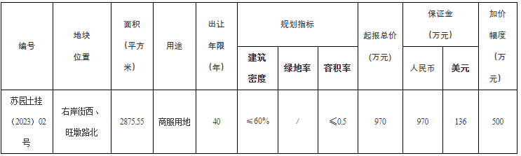 6、成交通知:地塊成交后,網(wǎng)上出讓系統(tǒng)自動生成《網(wǎng)上掛牌出讓成交通知書》。競得人應(yīng)按成交通知書要求,于該地塊網(wǎng)上出讓系統(tǒng)確認(rèn)競得之日起5個工作日內(nèi)(最晚于2023年9月4日16:00前),持成交通知書及有效證件原件、復(fù)印件等提交蘇州工業(yè)園區(qū)土地儲備中心進(jìn)行競買資格審查。