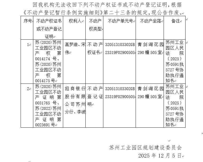 不動產權證書/登記證明作廢公告蘇園 證廢字2025(0185)號(青劍湖花園290幢505室)