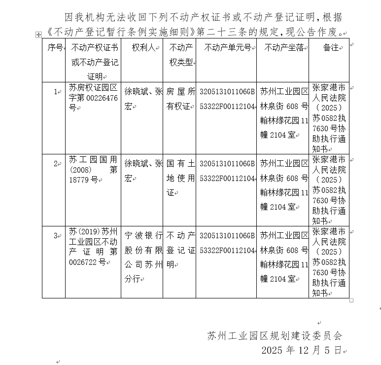 不動產(chǎn)權證書/登記證明作廢公告蘇園 證廢字2025(0197)號(翰林緣花園11幢2104室)