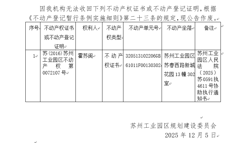 不動產(chǎn)權(quán)證書/登記證明作廢公告蘇園 證廢字2025(0184)號(新城花園13幢302室)
