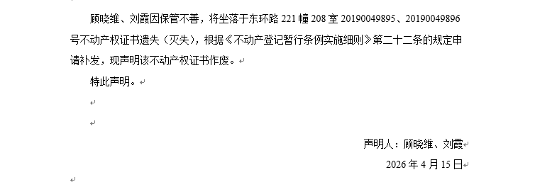 關(guān)于東環(huán)路221幢208室20190049895、20190049896號不動產(chǎn)權(quán)證書遺失聲明