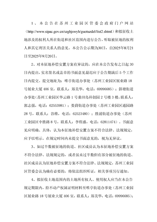 蘇州工業(yè)園區(qū)2025年度第8批次城市建設用地--蘇州工業(yè)園區(qū)管理委員會征地補償安置方案公告(蘇工園征補安置〔2025〕005號)
