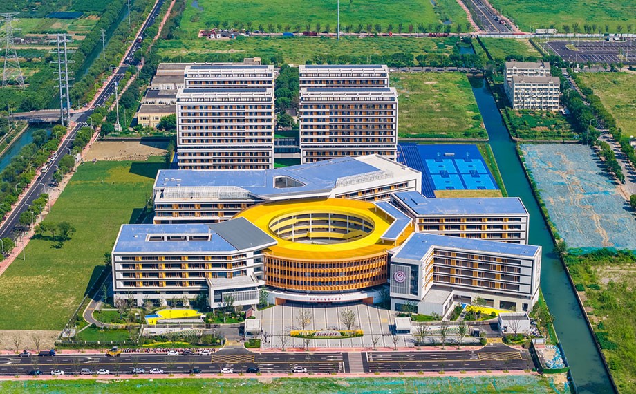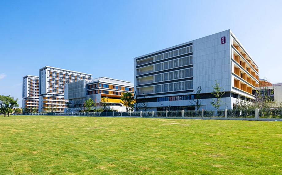 綠地為底,藍天為幕,橙白相間的校舍樓宇各自矗立,分外耀眼。俯瞰校園,以橙色圓弧形教學樓為中心,原本各自為陣的建筑呈現“眾星拱月”之勢,通過圓弧建筑的“接引”,成為有機聯系的一個整體。