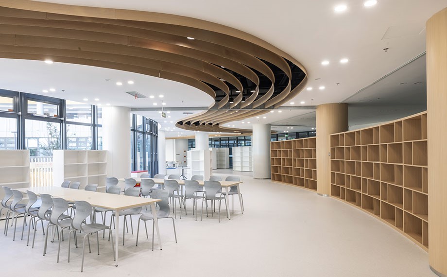 “高中階段是學生求學的關鍵時期。我們結合高中學習和生活實際,圍繞‘定制化學習社區’和‘高效互聯空間’兩個理念設計,希望以一流的校園設計托舉學生的身心健康發展。”學校代建方蘇州工業園區城市重建有限公司項目經理江海洋介紹,在空間布局上,三個年級的教學區域有明確區分,通過圓弧樞紐形成與行政樓、教學樓和藝體樓的巧妙串聯,搭建空間連廊、下沉廣場和地下通道的暢行通道,讓老師的教學管理、學生的食堂用餐和跨年級交流研討等活動更加方便高效。
