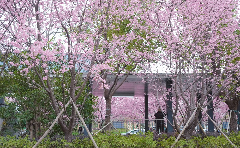錦溪公園內(nèi),椿寒櫻開得熱烈,滿樹繁花如云似霞,白日里花影綽約,晚間夜櫻與藍調(diào)天空相映成趣,燈光勾勒花影,氛圍感十足,別有一番靜謐溫柔的景致。現(xiàn)代大道旁,新城鄰里中心門口,早櫻也盡數(shù)盛放,柔粉色花瓣隨風輕舞,路過的行人紛紛駐足定格美好,來一場愜意citywalk,自在又舒心。