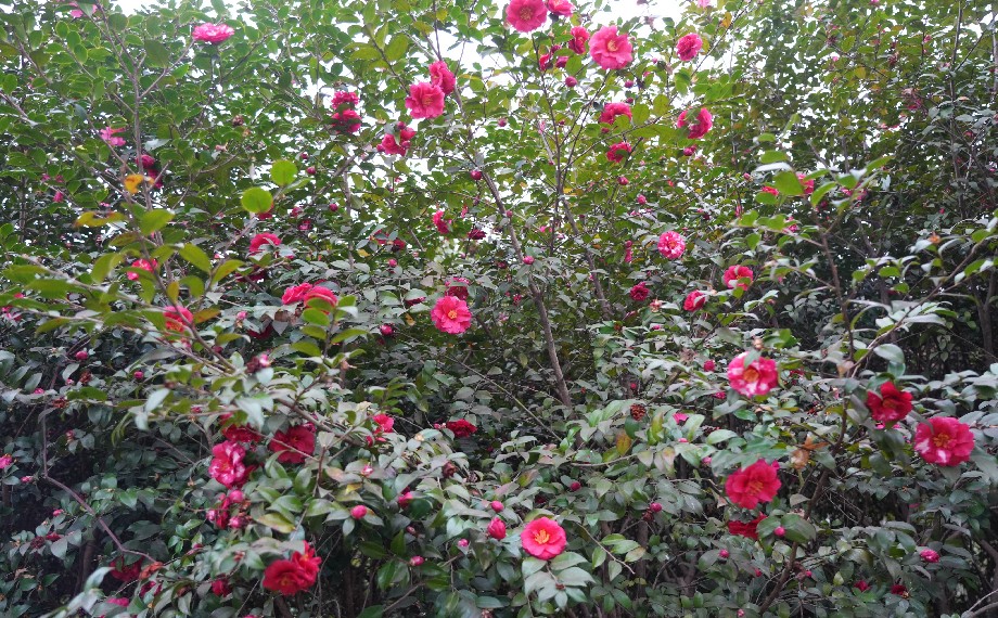 除了爛漫春花,園區(qū)的山茶花也悄然綻放,為春日添上一抹濃艷溫婉的色彩。山茶花株株挺拔,花瓣層疊舒展,在綠葉的映襯下更顯嬌艷動人。