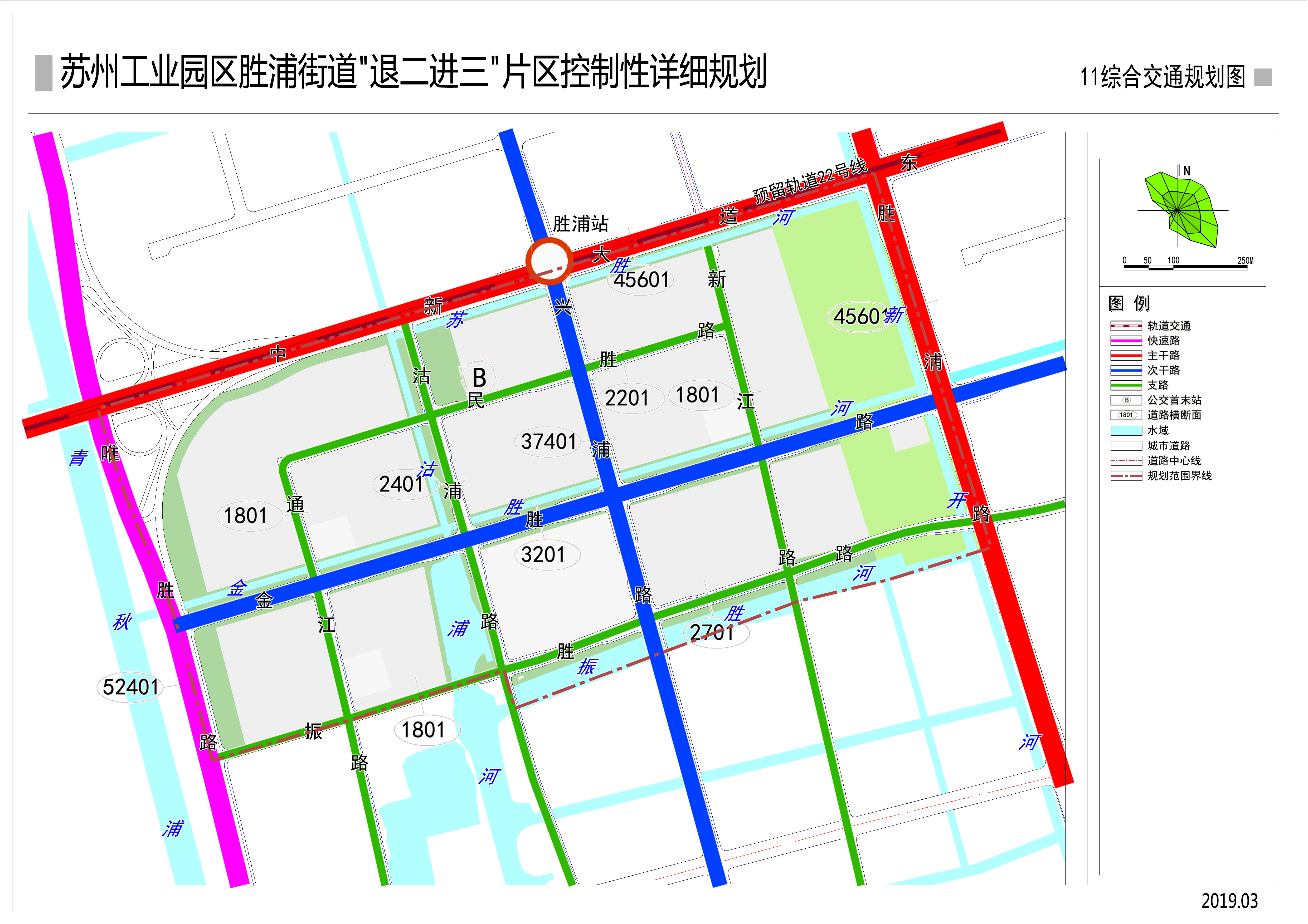 次干路為金勝路和興浦路,金勝路紅線控制為32米,興浦路紅線控制為37.4米,規劃范圍次干路總長度約為2.43公里。