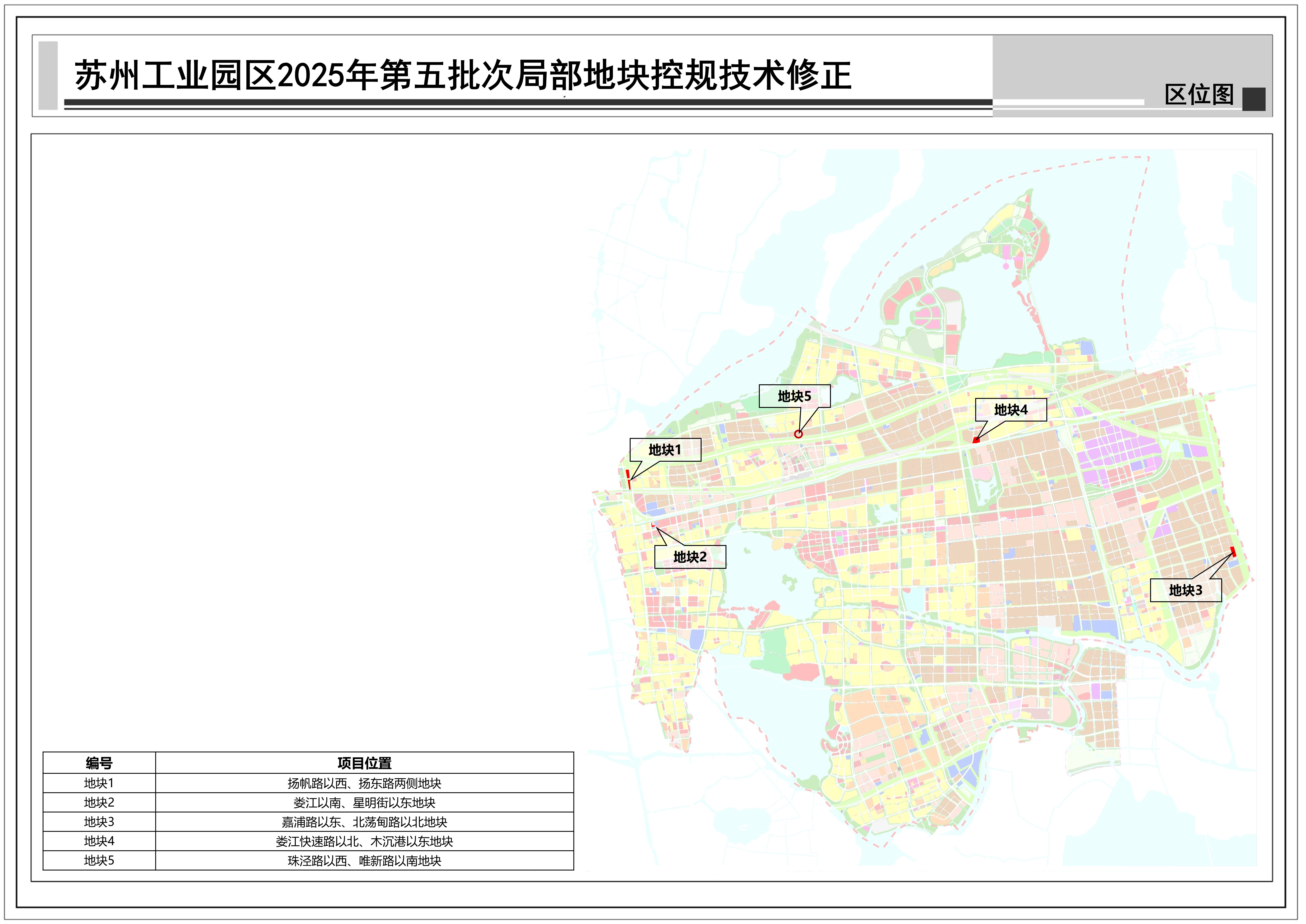 蘇州工業園區2025年第五批次局部地塊控規技術修正:共包括5個地塊,總用地面積約0.15平方公里,詳見附圖區位圖。