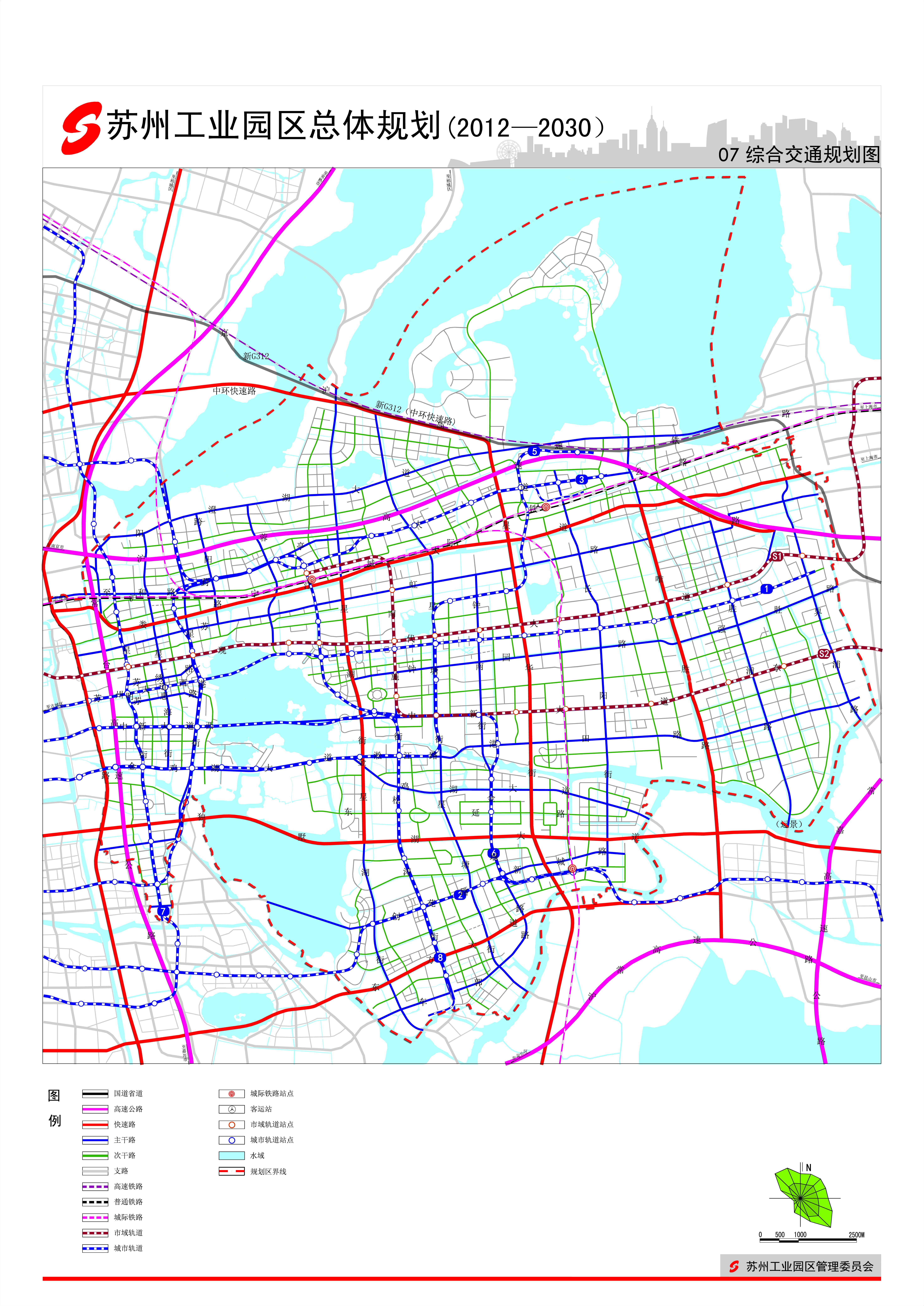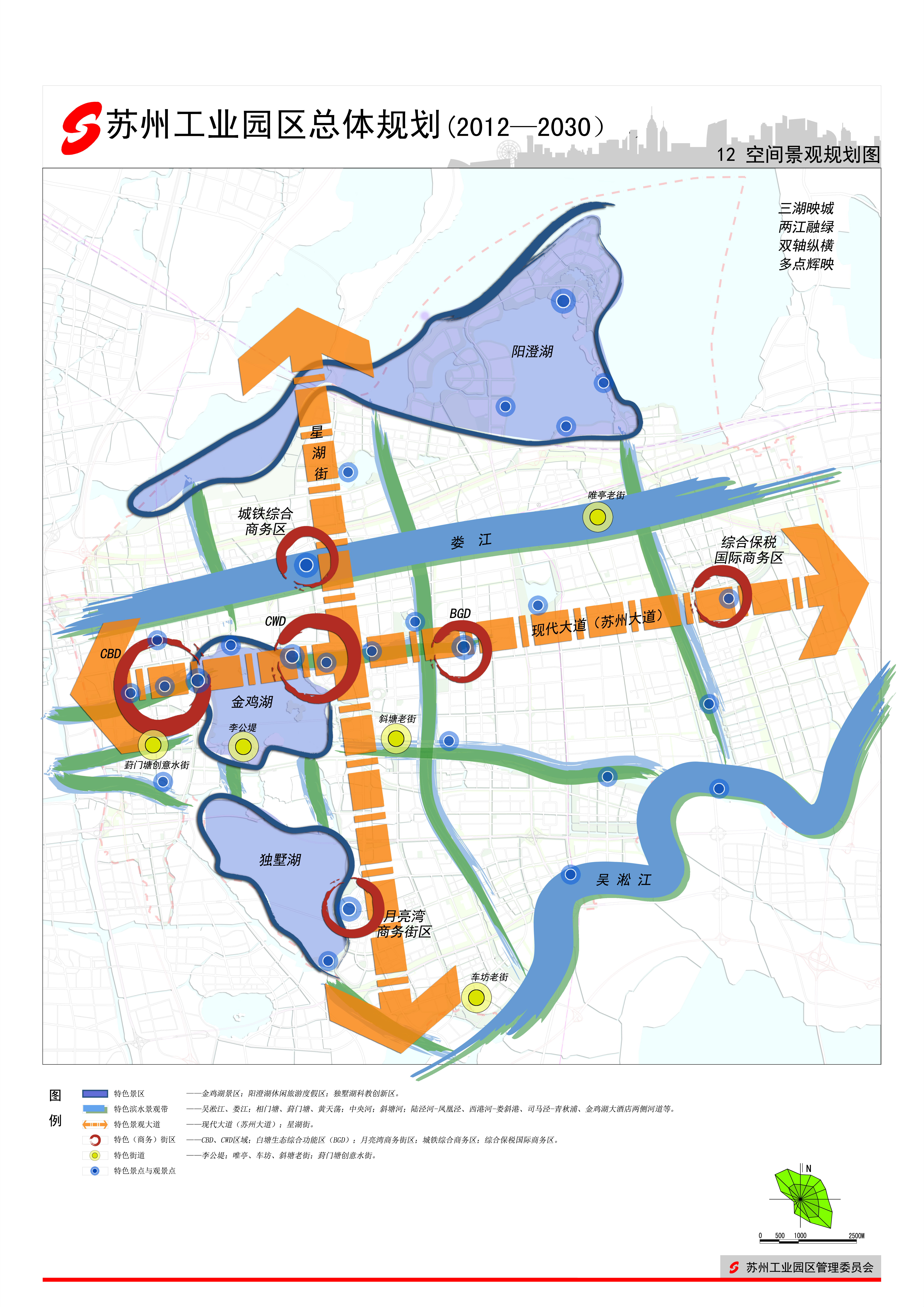 規(guī)劃形成“雙核多心十字軸、四片多區(qū)異彩呈”的空間結(jié)構(gòu)。雙核:湖西CBD、湖東CWD圍繞金雞湖合力發(fā)展,形成園區(qū)城市核心區(qū)。多心:結(jié)合城際軌道站點(diǎn)、城市軌道站點(diǎn)、功能區(qū)中心形成三副多點(diǎn)的中心空間。十字軸:結(jié)合各功能片區(qū)中心分布,沿東西向城市軌道線和南北向城市公交走廊,形成十字型發(fā)展軸,加強(qiáng)周邊地區(qū)與中心區(qū)的聯(lián)系。四片多區(qū):包括婁葑、斜塘、勝浦和唯亭街道四片,每片結(jié)合功能又劃分為若干片區(qū)。