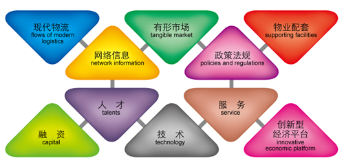 近代物流、インタネットインフォメーション、有形市場、政策法規、物業管理、融資、人材、技術、サービスとクリエート経済プラットフォーム等を內容とするソフトウェア産業に関する「九通一平」プロジェクトは地域情報化レベルと新興産業を促進できる能力をアップさせる。