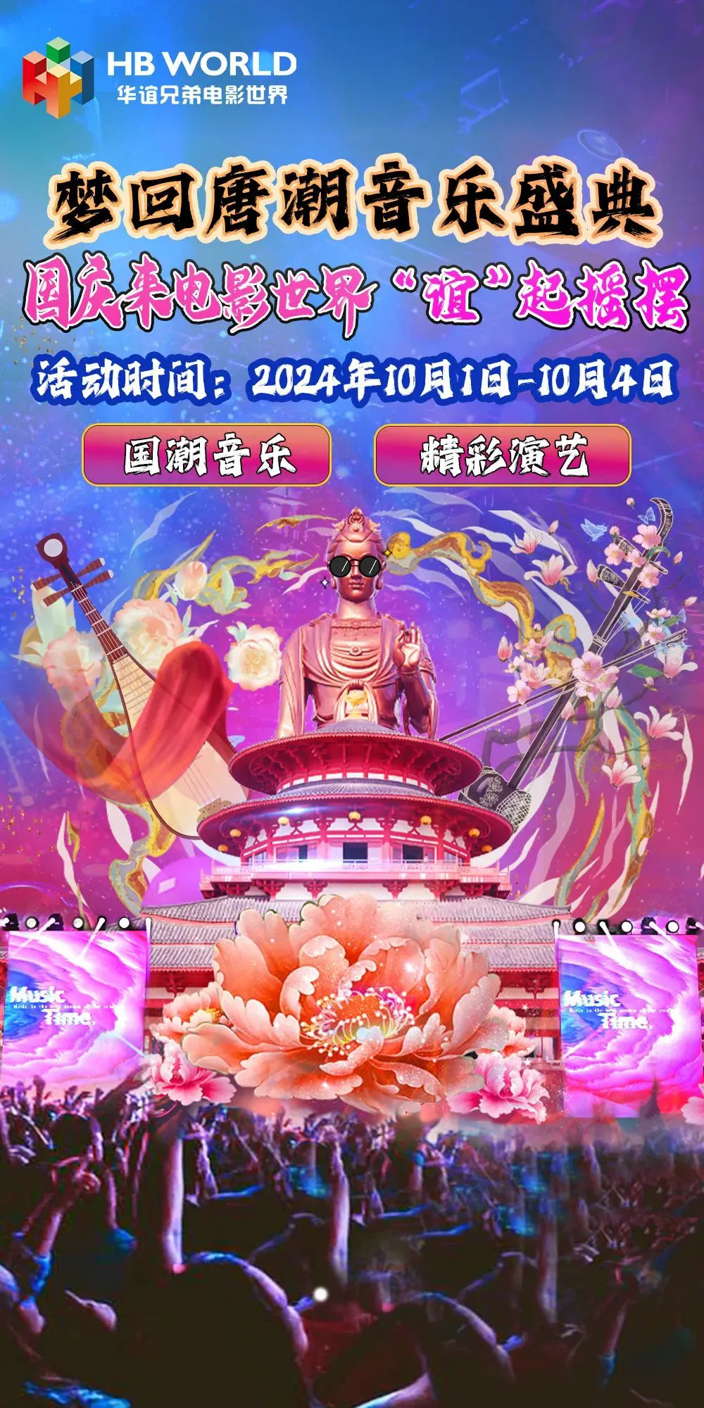 10月1日至4日,華誼兄弟電影世界帶來(lái)了“夢(mèng)回唐潮音樂(lè)盛典”。每天50場(chǎng)+演出,紅紅火火迎國(guó)慶,現(xiàn)場(chǎng)唐樂(lè)演奏、國(guó)潮DJ、鼓踏飛燕熱鬧非凡!更有20+游樂(lè)設(shè)施免費(fèi)游玩包你值回票價(jià)!
