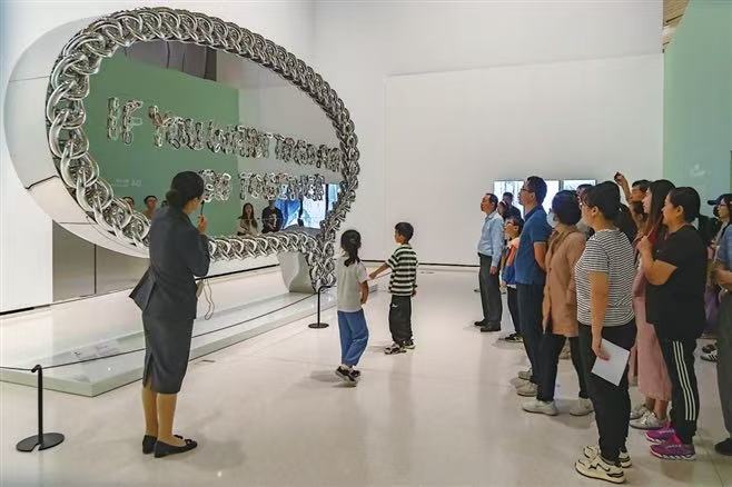 “華獅藝錦——中國·新加坡當代藝術三十年”正在金雞湖畔的蘇州當代美術館熱展,作品集納了兩國藝術家作品近百件。圖為昨日美術館講解員正在為觀眾講解。
