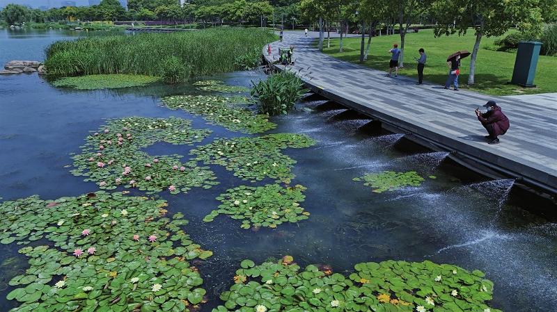 昨天,環(huán)金雞湖步道新安裝的凈水系統(tǒng)啟用,一排噴頭不斷向湖面噴射清水,使湖水快速流動,有效防止藍藻滋生。清澈的湖面上睡蓮盛放,引來行人駐足觀賞。