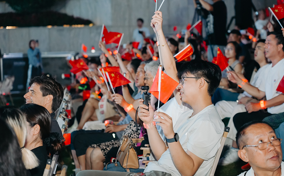 舞臺下,閃爍的熒光手環和舞動的小紅旗則是觀眾們的熱烈應答。市民張女士與孩子一起席地而坐,一起欣賞著樂團的演奏,一邊在報幕的間隙為孩子解釋影片和樂曲的背景。她說:“有些電影我小時候看過,配樂非常經典,在蘇交的演繹下更顯氣勢磅礴。在今天這個日子里,這一場音樂會既是藝術的盛宴,更是一次家國情懷的滋養。”