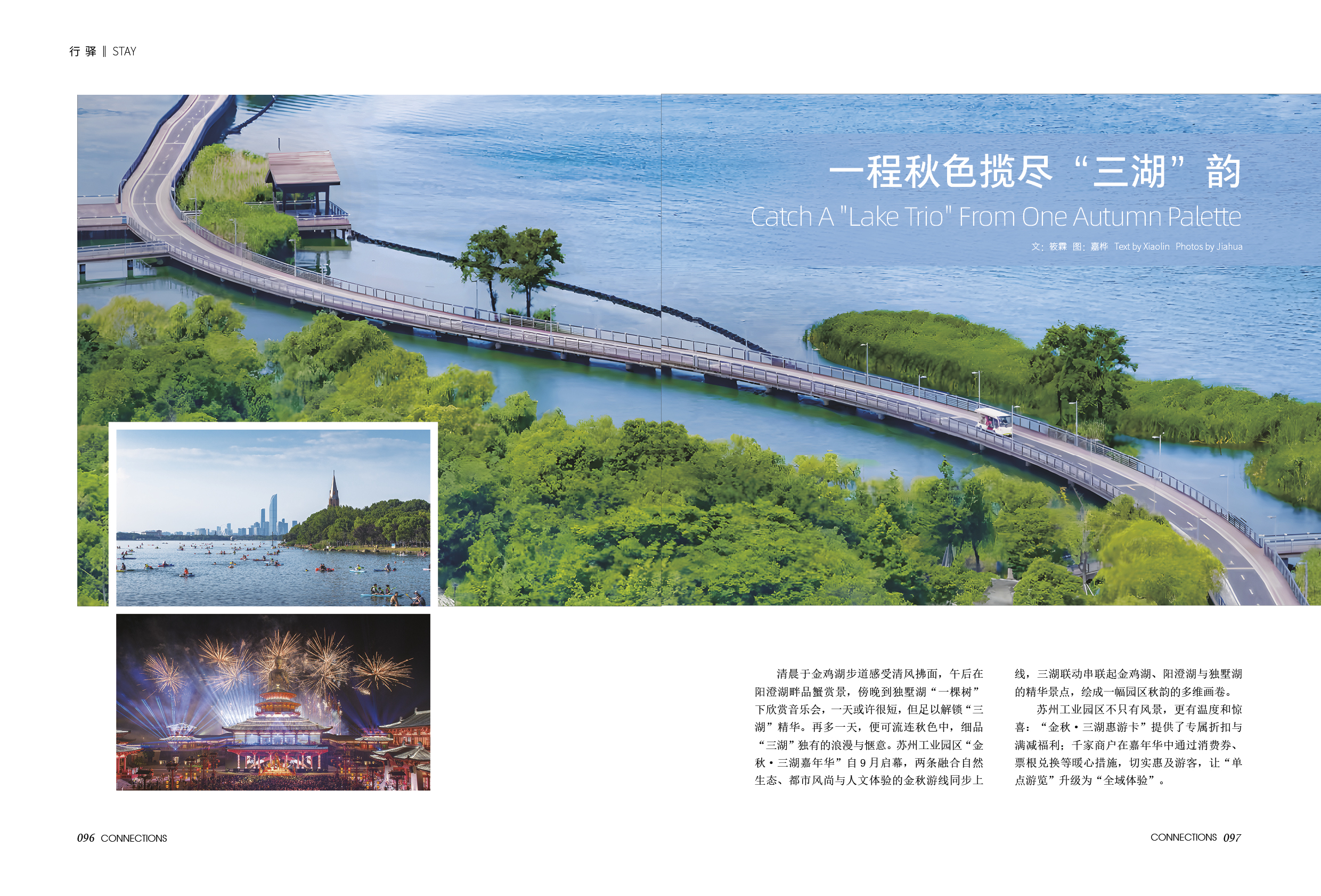 在本期《東方航空》雜志中,蘇州工業(yè)園區(qū)的三湖秋色一覽無(wú)余。文章通過(guò)“浪漫金雞湖的歸心旅途”、“蟹肥秋濃,滿澄盡啖黃金甲”、“蕩起雙槳,獨(dú)墅湖涌動(dòng)青春活力”三個(gè)板塊,將園區(qū)的秋韻花卷娓娓道來(lái)。它向讀者呈現(xiàn)了金雞湖的都市繁華、陽(yáng)澄湖的肥美湖鮮,以及獨(dú)墅湖的青春活力,讓東航國(guó)際國(guó)內(nèi)旅客在高空閱讀中,感受到蘇州工業(yè)園區(qū)的開放、友好與活力。