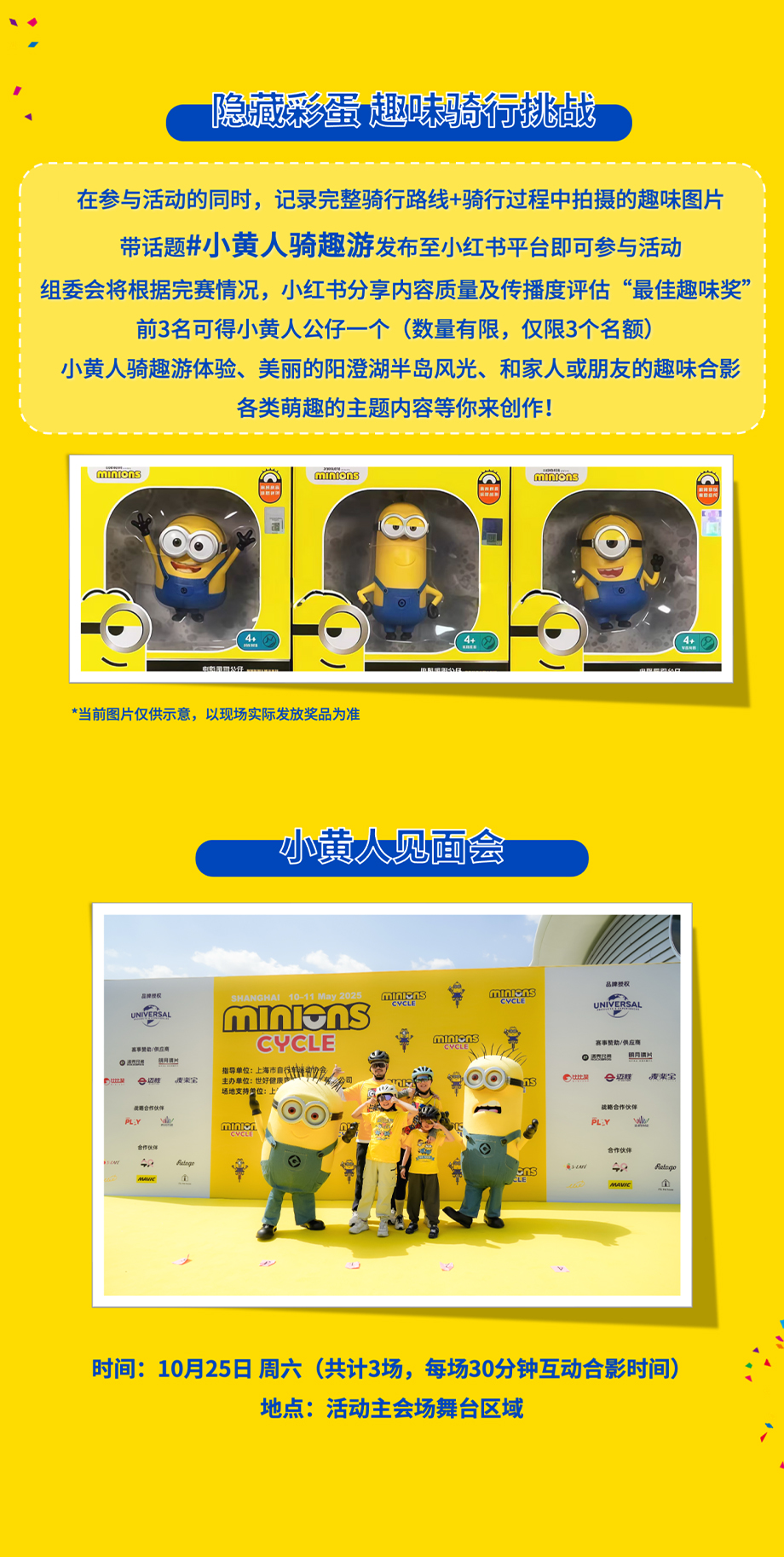 此外,在參與活動(dòng)的同時(shí),記錄完整騎行路線+騎行過(guò)程中拍攝的趣味圖片,帶話題#小黃人騎趣游發(fā)布至小紅書(shū)平臺(tái)還可參與“隱藏彩蛋趣味騎行挑戰(zhàn)”活動(dòng),后續(xù)活動(dòng)主辦方將根據(jù)完賽情況、小紅書(shū)分享內(nèi)容質(zhì)量及傳播度評(píng)估“最佳趣味獎(jiǎng)”,前3名可獲得小黃人公仔一個(gè)。