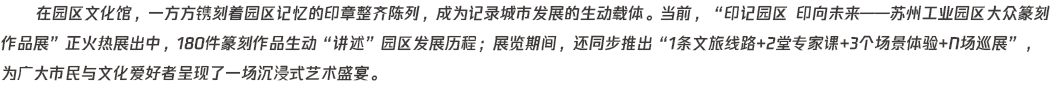 「印記園區(qū)印向未來」蘇州工業(yè)園區(qū)大眾篆刻作品展持續(xù)熱展中。傳統(tǒng)印面·對話當(dāng)代地標(biāo),歷史印記·融合未來表達,多維創(chuàng)作·科技賦能,十余種創(chuàng)新治印... [詳細]