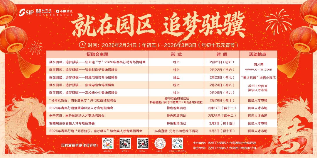 即日起至3月3日,園區人才市場還將陸續推出數字經濟、電子信息與半導體制造、智能制造、綜合類人才等專場招聘會;3月底前,將聯動區人力資源市場及各街道開展“春風行動”,密集組織線上線下主題招聘活動45場,構建全方位、多層次招聘服務體系,實現節前穩崗與節后復工有效銜接,以充足人才供給賦能園區經濟高質量發展,讓更多人才在園區成就事業、實現夢想。