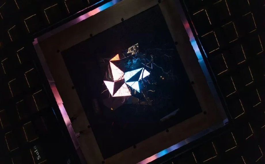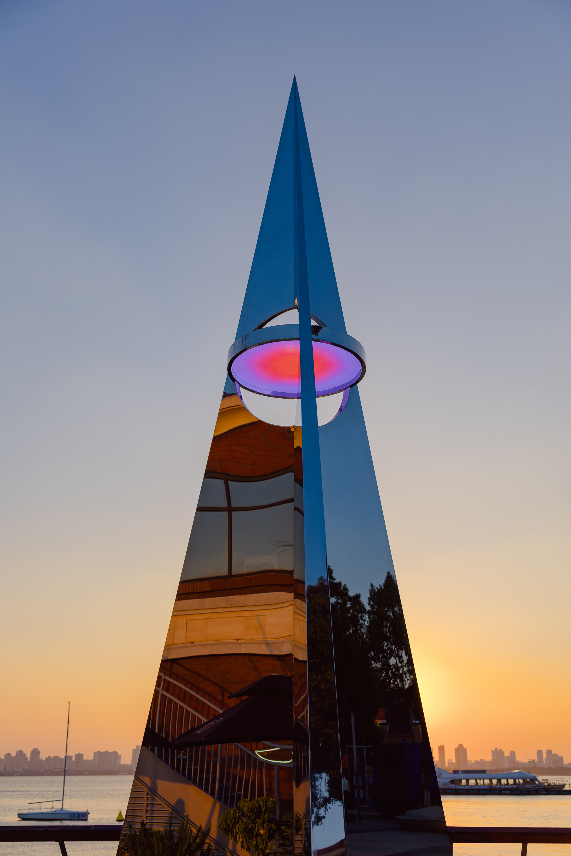 《問境》以紙飛機為靈感、以火箭升空姿態為造型,主體采用純鏡面不銹鋼材質,曾先后在深圳、杭州、上海等城市巡展,擁有極高的藝術口碑。裝置隨天光流轉與季節更迭,倒映出金雞湖的粼粼波影、澄澈天空與城市輪廓,營造出錯位的空間感。其設計暗藏巧思,裝置中心3.84米高處懸掛的圓形天境燈,象征著地月之距,可依自然光譜智能調光,燈光經鏡面折射后,與湖畔夜景交融成一幅靈動畫卷;無論從何種角度仰望,鏡中皆能望見“完整月亮”,寓意著在萬象紛繁中窺見內在的完整與純粹。每一次駐足都能捕捉到獨一無二的光影畫面,隨手一拍皆是自帶濾鏡的大片。