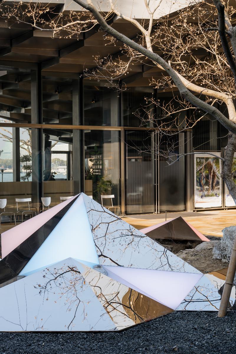 《疊石窺天》的設計靈感源自蘇式園林中的“疊石”造景,以簡潔的幾何線條結構,重塑傳統山石的意象。裝置同樣采用鏡面不銹鋼材質,通過角度設計,將天空、流云、建筑與人影盡數收納其中,仿佛將天地萬物折疊延展于方寸庭院之間,營造出兼具現代感與東方意趣的“鏡庭”景觀。其色彩隨自然節律不斷變幻,白晝時,折射出青綠與淡藍的光暈;日暮降臨,色調漸次過渡為粉紫色;夜幕低垂,又化作溫暖橙紅,每一時段都能呈現出截然不同的藝術美感。