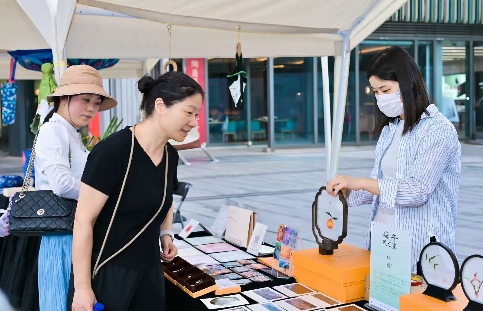 活動中,青年評彈演員朱江帶來以蘇州工業園區為背景的原創曲目《金雞起舞》,以現代藝術形式展現了園區的“古韻今風”,將氣氛推向高潮。現場熱鬧非凡,市民游客不僅觀賞到了精美的緙絲藝術展,還積極參與了吹糖人、漆扇制作等互動體驗。這些端午傳統民俗活動讓市民在感受文化魅力的同時,也充分體驗到了節日的祥和氛圍。