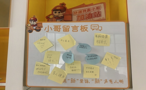 這里召開了“新就業群體座談會”,通過面對面與美團、餓了么、叮咚買菜等小哥交流,了解他們的實際需求等。客廳內設置有“小哥留言板”,讓您心煩可傾訴、“新”聲有人聽。