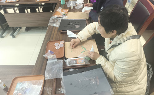 社區活動室內一片歡聲笑語,20余位居民在“紅色管家”志愿者的帶領下,開啟了一場螺鈿藝術的體驗之旅。老師首先向大家介紹了螺鈿工藝的歷史淵源。這項起源于商周時期的傳統鑲嵌藝術——以貝殼為原料,通過打磨、拼接形成精美紋樣——曾是宮廷裝飾的重要工藝。在老師的指導下,居民們手持工具,將一片片螺鈿細致地嵌入木質底座上,有的拼出梅花傲雪,有的嵌成動物圖案,有的組成“福”字紋樣。最后,大家將完成的作品裝入相框,封存住了這份親手創作的傳統之美。