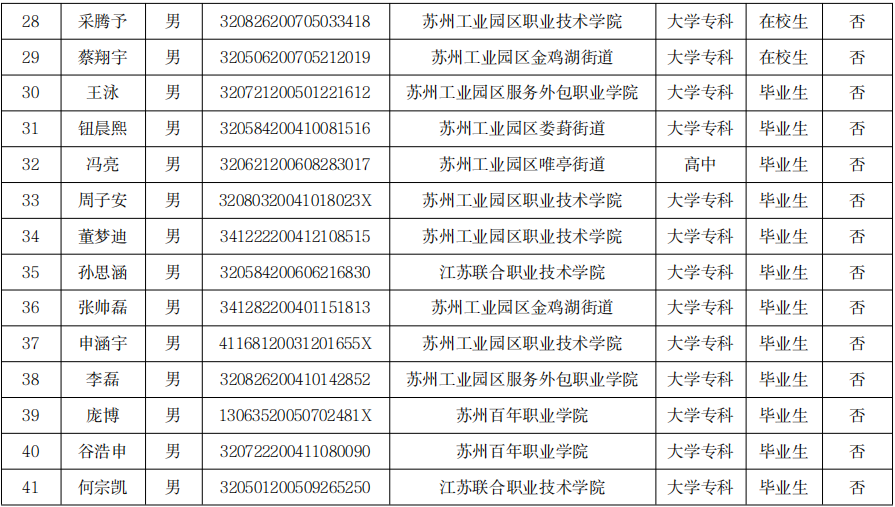 根據(jù)省、市征兵工作要求,蘇州工業(yè)園區(qū)征兵辦按照身體檢查、政治考核、役前教育、集體定兵會(huì)等程序,批準(zhǔn)了41名應(yīng)征青年入伍,現(xiàn)將人員名單向社會(huì)公布,并接受各界監(jiān)督。