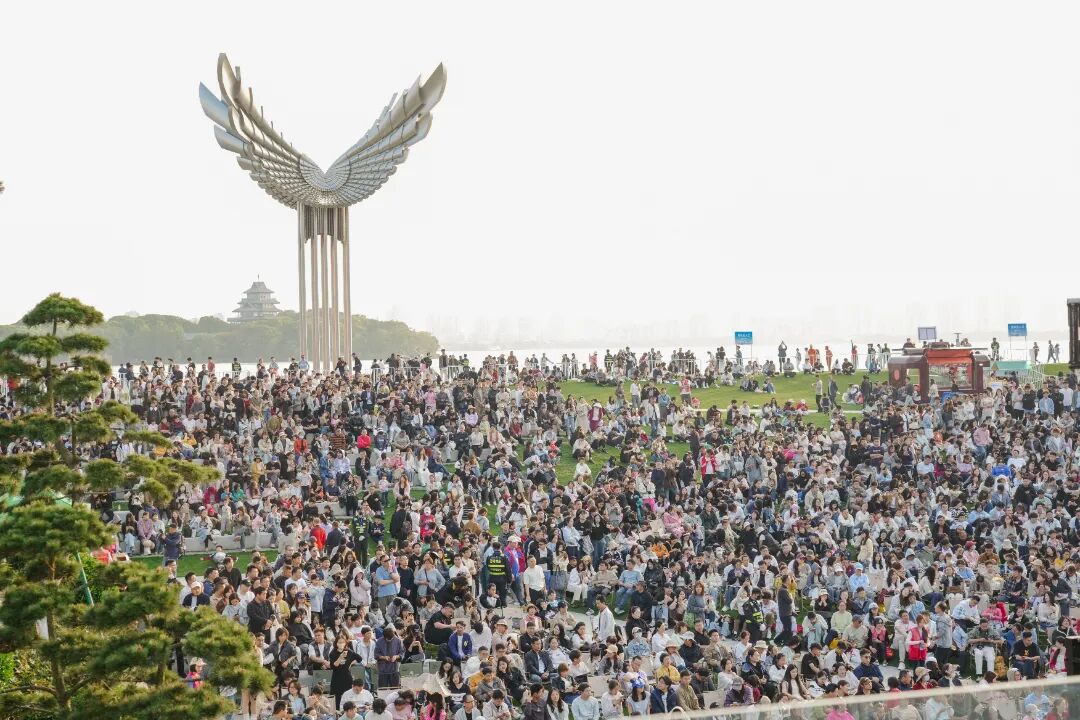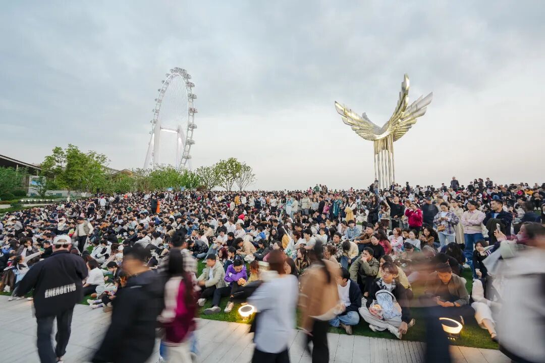 夜色漸染,舞臺燈光早早亮起。金雞湖畔、摩天輪下、飛翔雕塑旁,熙熙攘攘的人群不斷向右岸客廳下沉廣場匯聚。