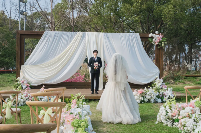 以潮流時尚婚禮為主題,桃花島還與環湖酒店夢幻聯動,從碼頭到湖心再到酒店,將對新人的祝福化作水岸聯動的唯美旅程。同時,草坪婚禮場地結合桃林景致與湖光背景完成春日氛圍布置,可滿足新人對不同風格婚拍、婚禮的個性化需求。
