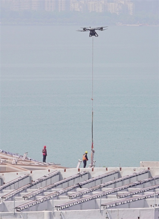 昨天,園區(qū)鐘園路一建筑工地,施工人員借助無人機進行吊裝作業(yè),提升作業(yè)效率與安全性。