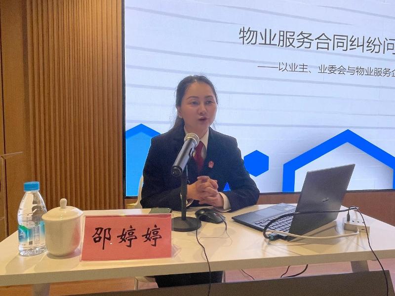 園區法院員額法官邵婷婷一直從事物業、勞動爭議審判工作,她將法律理論與實戰案例深度融合,依次闡述了物業糾紛的主要類型、多種成因、化解難點,深入淺出講述物業服務合同糾紛的法律依據、處理要點,依托具體案例現場模擬業主、業委會、物業三方對話,“沉浸式”教學給在場學員們打開了調解新思路。