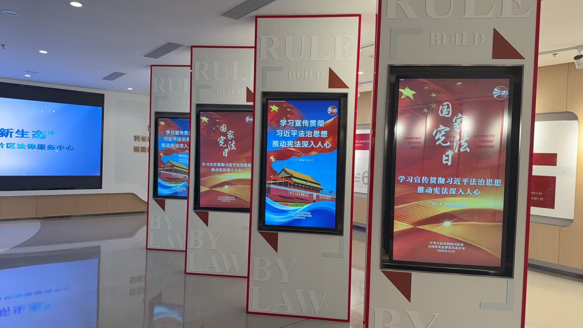 各單位依托門戶網站、微信公眾號等新媒體平臺,法治陣地、商業中心、載體樓宇等公共電子屏開展憲法宣傳“萬屏聯播”,構建全方位、多層次的線上普法格局,讓憲法精神在指尖流轉、深入人心。園區司法局依托蘇州自貿片區法宣中心展播憲法主題海報。園區宣傳和統戰部、園區行政審批局、陽澄湖半島旅游度假區等單位在草鞋山公園、辦事服務大廳、綜合治理中心等地張貼海報。園區法院、園區生態環境局等依托新媒體矩陣發布憲法知識、普法漫畫。婁葑司法所推出《拆盲盒,學憲法》專題短片,從民生視角解讀憲法權益。