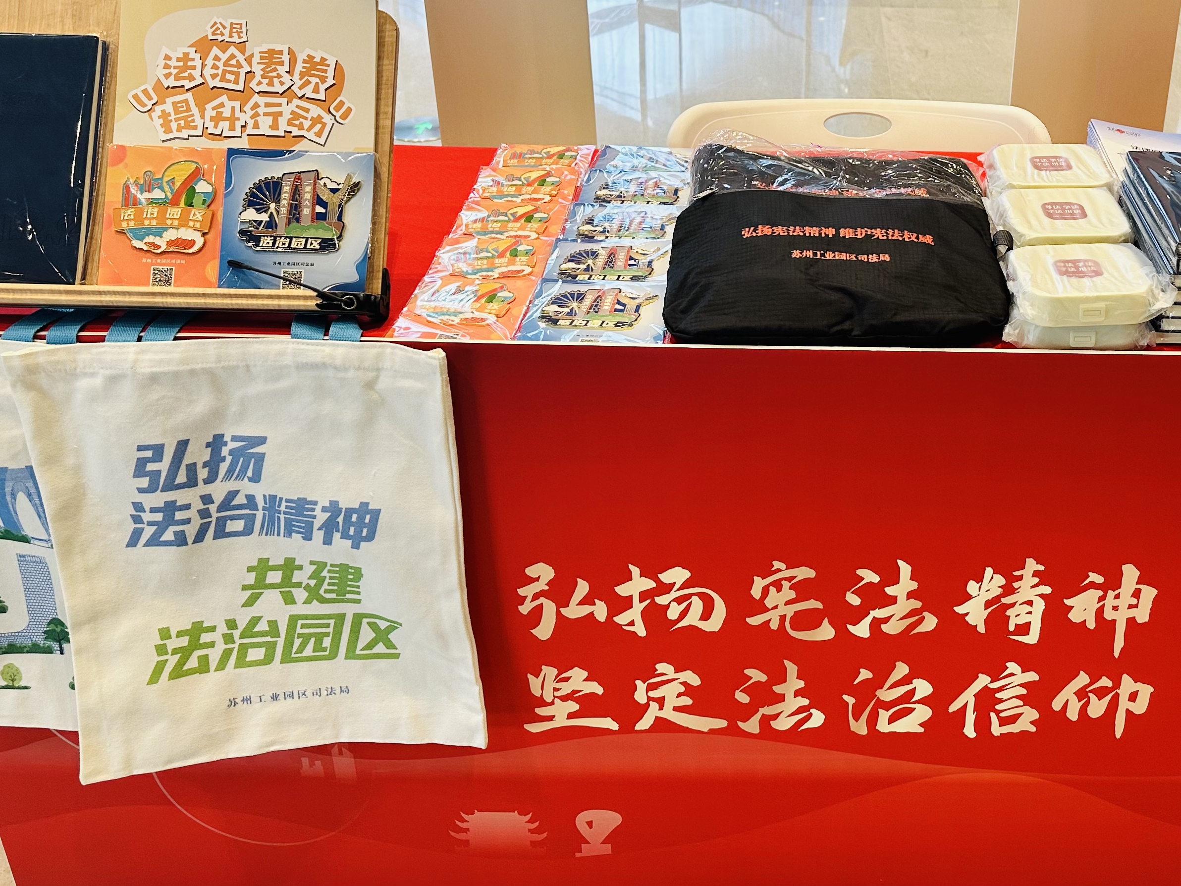 園區司法局聯合園區海關、金雞湖街道等在圓融時代廣場舉辦“憲在身邊 法潤金雞”法治市集,開啟憲法宣傳周系列活動序幕?,F場設置10個普法攤位,吸引近230名群眾參與,通過憲法知識問答、法律咨詢解答、案例解讀、游戲互動等形式宣傳憲法、反詐防非、掃黑除惡等法律知識,并提供暖心熱飲和法治手作,實現“普法宣傳+惠民服務”零距離。積極響應市局“弘揚憲法精神,堅定法治信仰”主題活動,在獅山大劇院設置“法潤園區·聚力前行”普法攤位,提供的法治帆布袋、文創冰箱貼等法治產品備受歡迎。