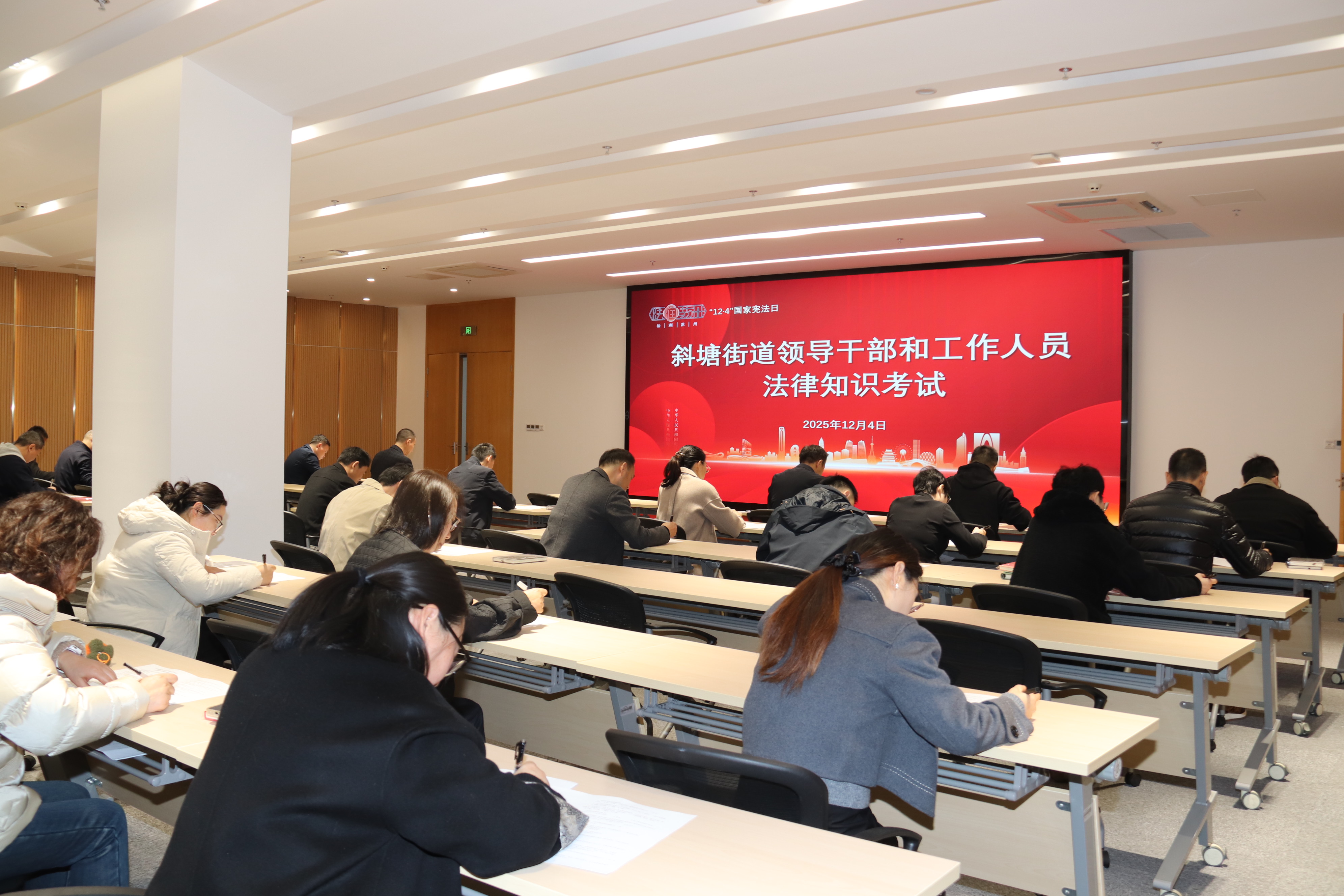 園區法院、園區檢察院組織新入額法官、政法干警開展國家憲法日宣誓活動。園區金融發展和風險防范局通過《中華人民共和國憲法》條文學習、宣傳片觀看、交流研討等方式強化干部依法履職意識。園區稅務局將憲法納入黨委中心組和各黨支部“三會一課”、主題黨日等重點學習內容,結合青年干部座談會開展專題學習研討。綜合行政執法局各街道執法大隊通過專題會議、知識競賽、普法講座等形式提升執法人員法治素養。斜塘街道開展“憲法進機關”帶頭考法活動。唯亭街道舉辦2025年“12·4”國家憲法日活動暨“法潤澄南 善治唯亭”總結大會,搭建高效交流學習平臺。金雞湖街道在辦公區域打造憲法學習場景,組織憲法圍讀,專題研習《中華人民共和國法治宣傳教育法》,探索普法新路徑。