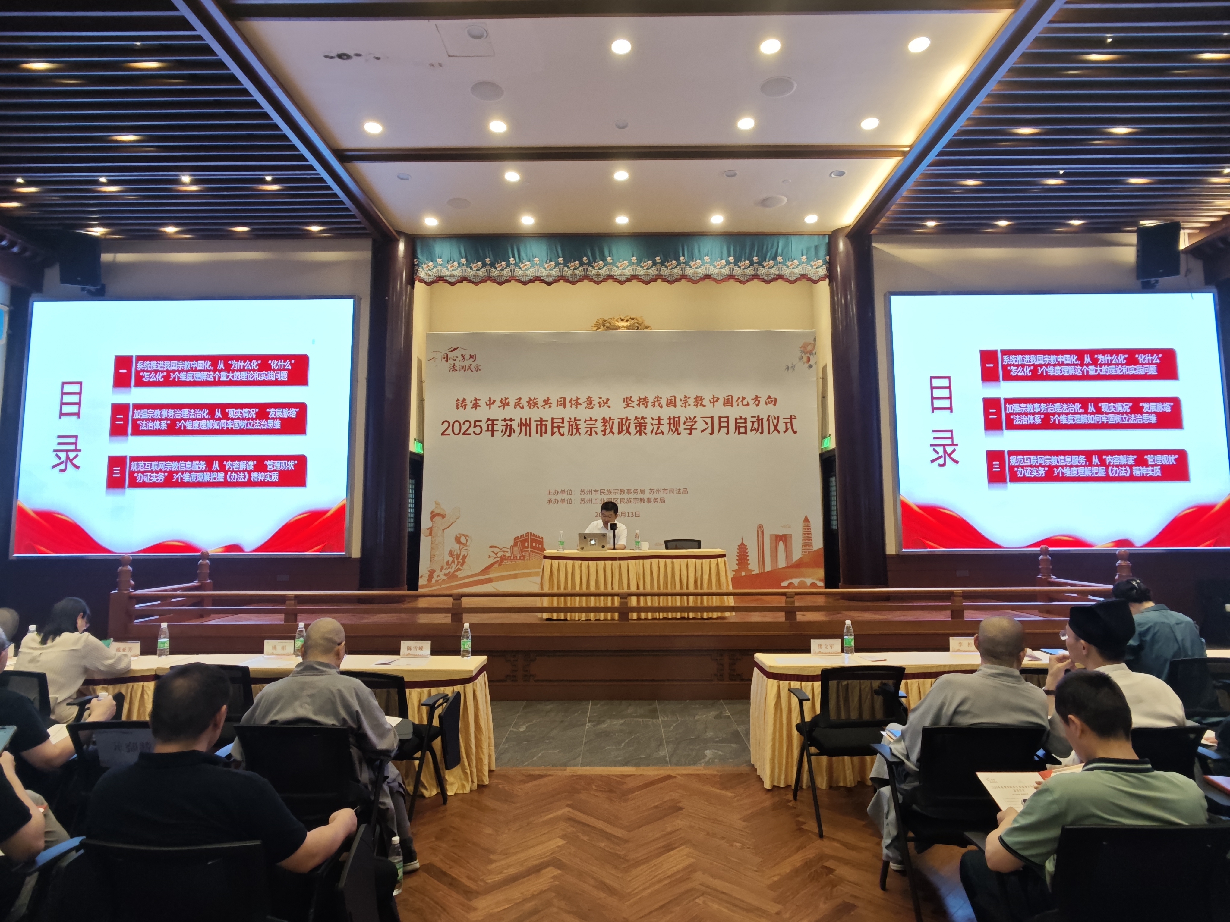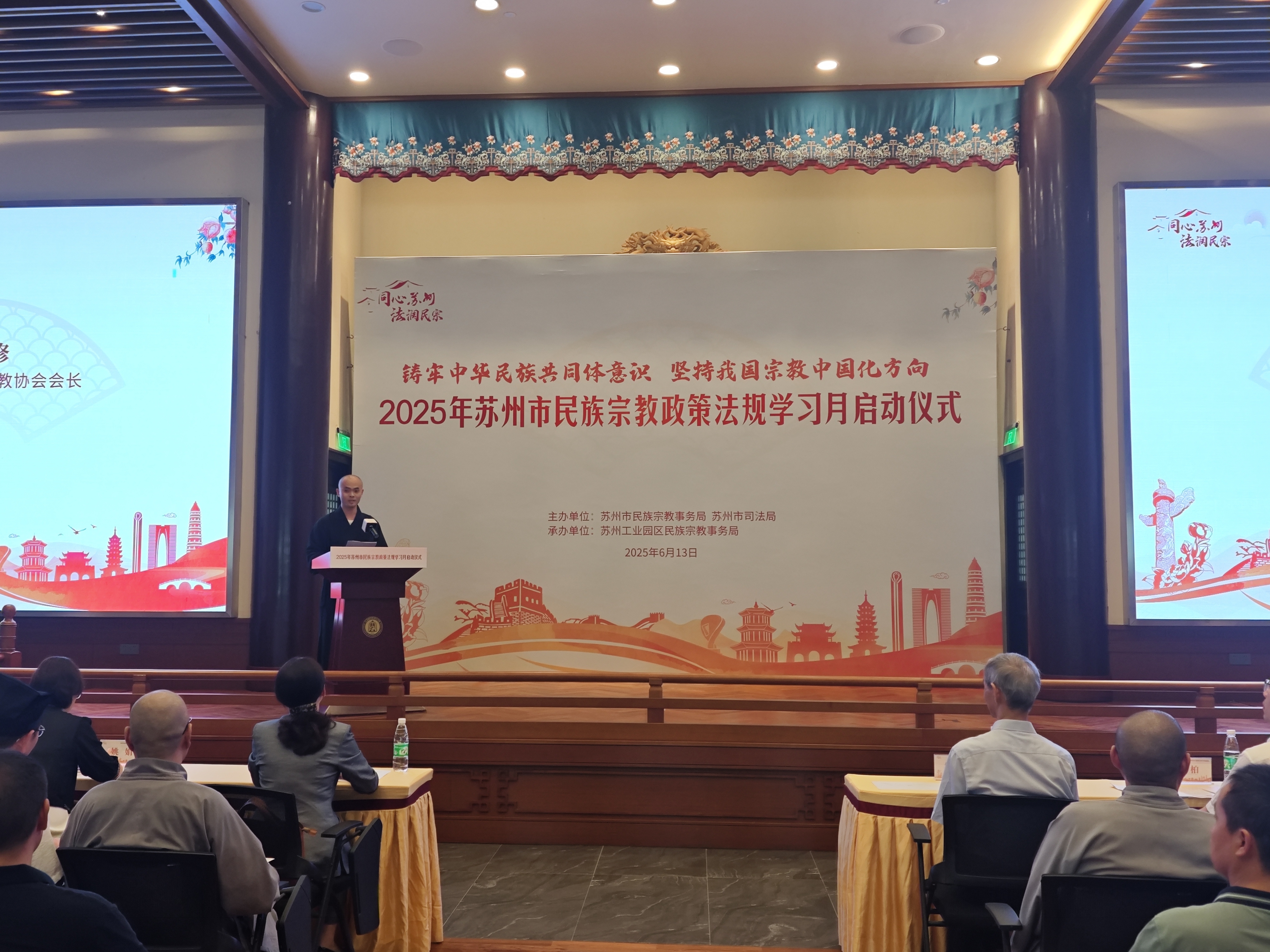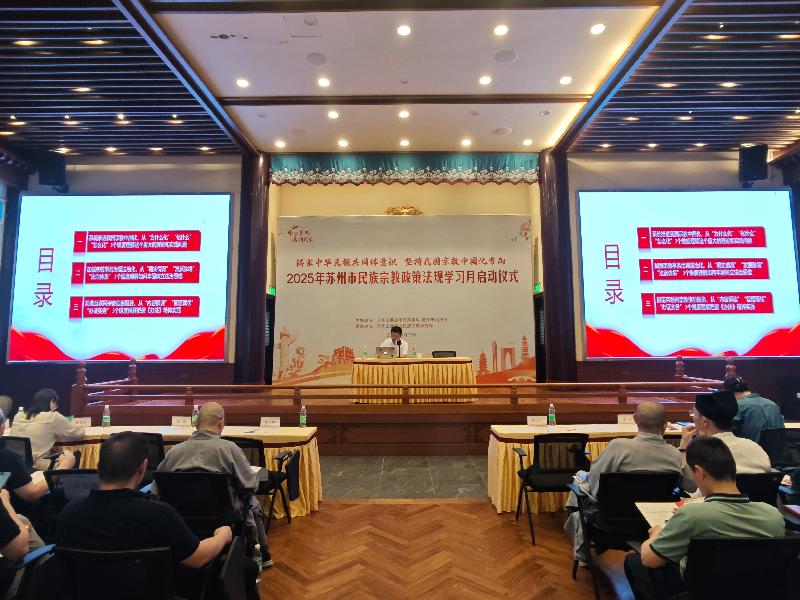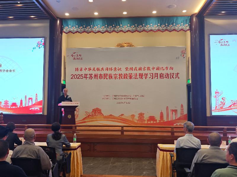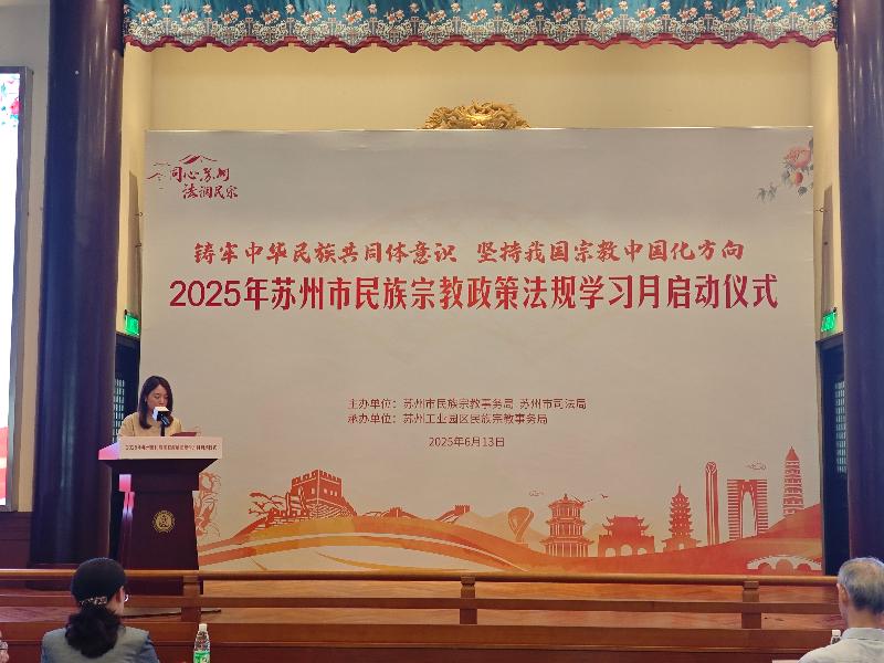 6月13日下午,由蘇州市民宗局、蘇州市司法局主辦,蘇州工業(yè)園區(qū)民宗局承辦的2025年蘇州市民族宗教政策法規(guī)學(xué)習(xí)月系列活動(dòng)在蘇州工業(yè)園區(qū)重元寺順利舉辦。園區(qū)宣傳和統(tǒng)戰(zhàn)部、各街道、各社區(qū)、民促會(huì)、各宗教團(tuán)體、各宗教院校、各宗教活動(dòng)場(chǎng)所有關(guān)負(fù)責(zé)人及社會(huì)各族各界代表人士等150余人參加了本次活動(dòng)。