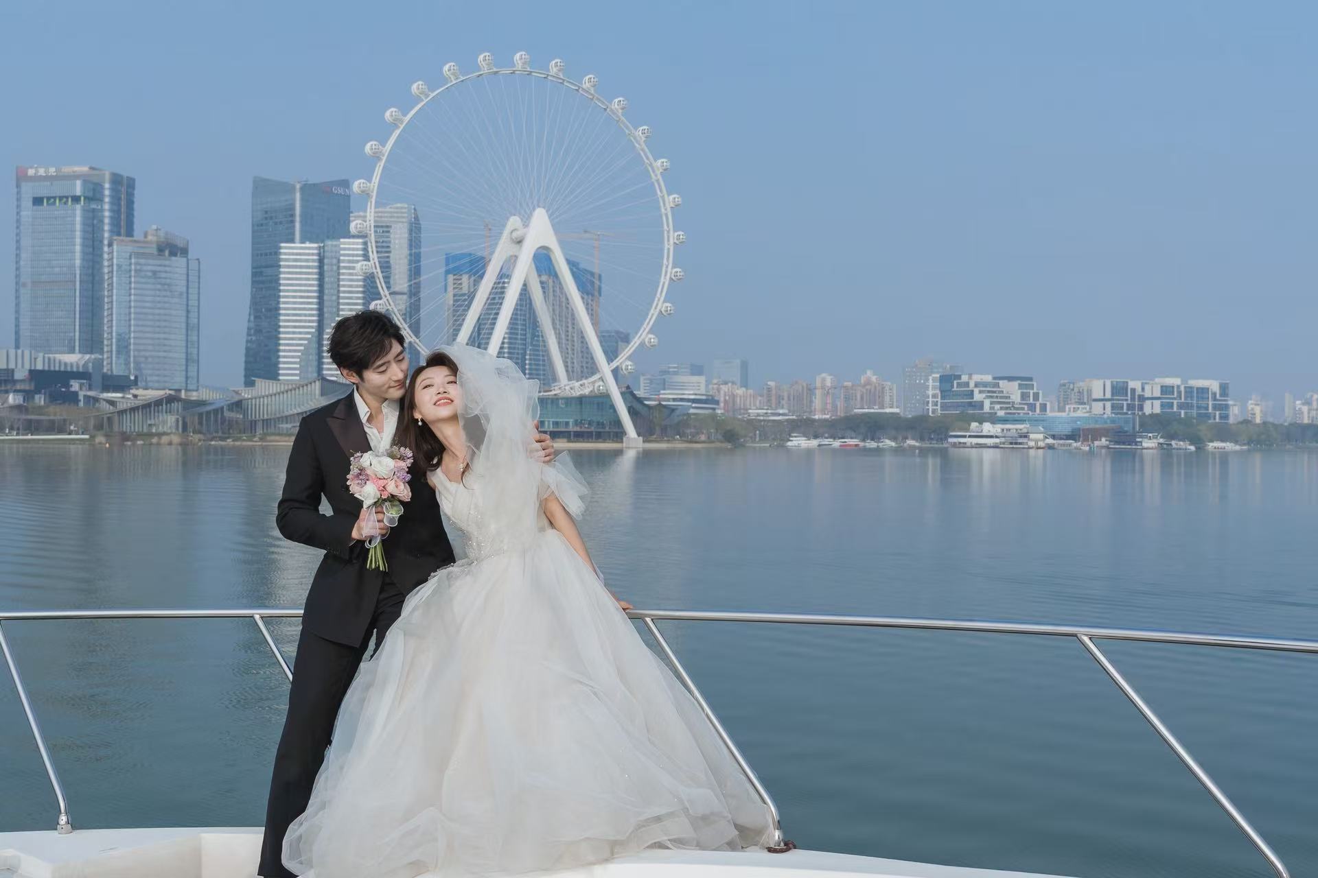 從右岸碼頭登船,一場流動的浪漫之旅隨之開啟。城市輪廓在船舷四周緩緩轉動,游船化作水上移動的取景框,將城市建筑之美盡數收入鏡頭,隨時定格相伴瞬間,每一幀畫面都自帶度假氛圍與摩登詩意。行程將婚拍旅拍與游湖觀光深度融合,一鍵解鎖“水上城市”的獨特視角。