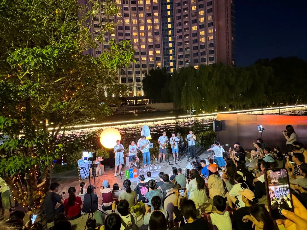 Suzhou Philharmonic Orchestra performed a list of classic music works outside Suzhou Eslite Bookstore. The music drifted through the summer night breeze, as the audience—seated or standing—occasionally hummed along softly.