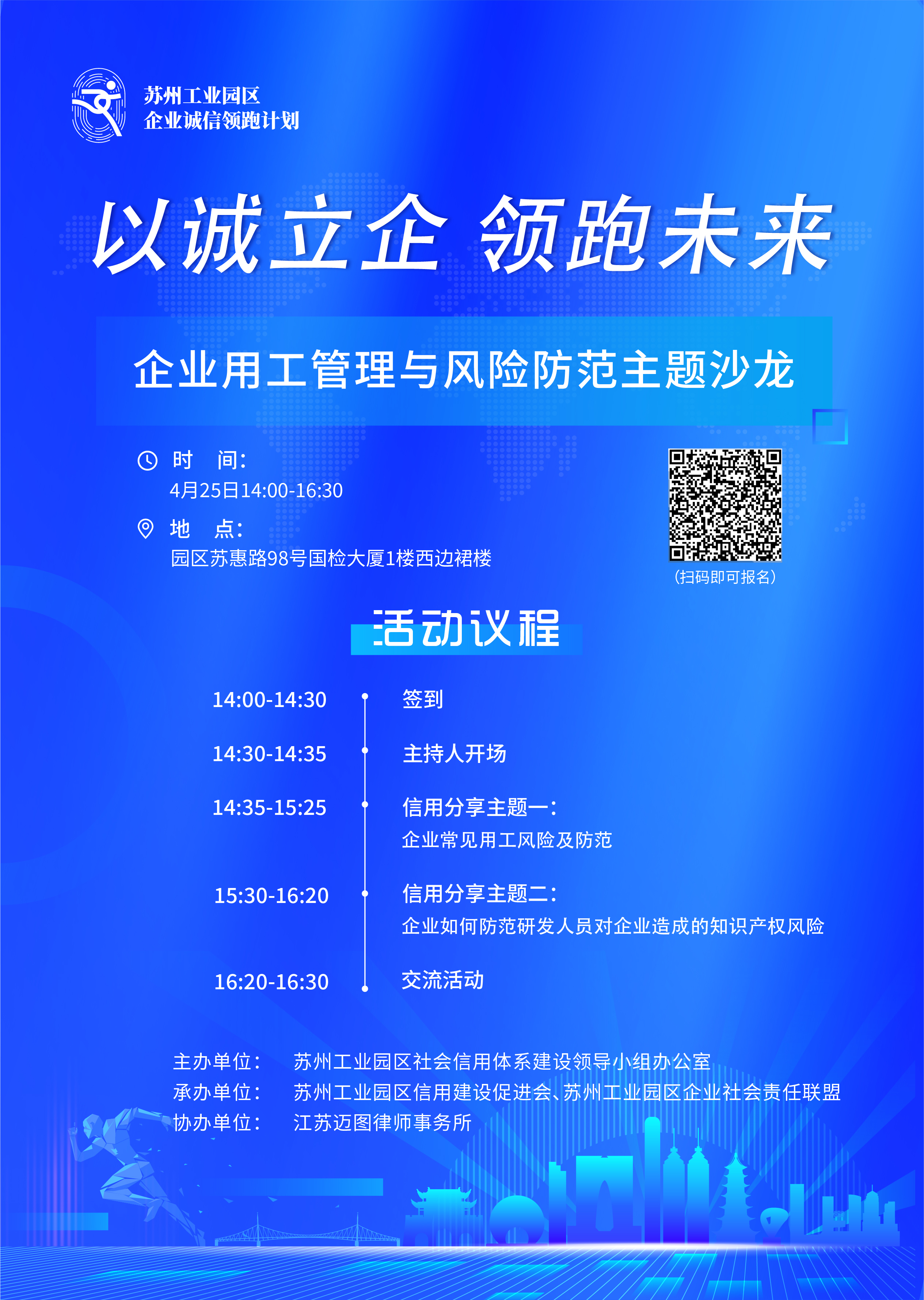 企業勞動用工常見的風險有哪些?如何預防這些風險的發生?員工職場誠信如何建設?針對上述問題,園區“企業誠信領跑計劃”定于4月25日舉辦系列活動之企業用工管理與風險防范主題沙龍,邀請律所專家開展分享交流活動,共探新形勢下用工風險防控和合規管理新思路。