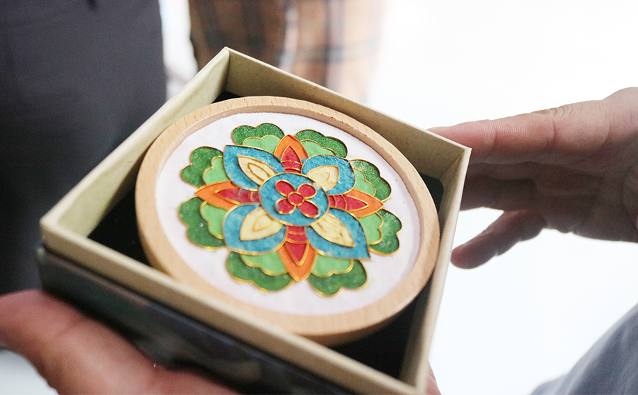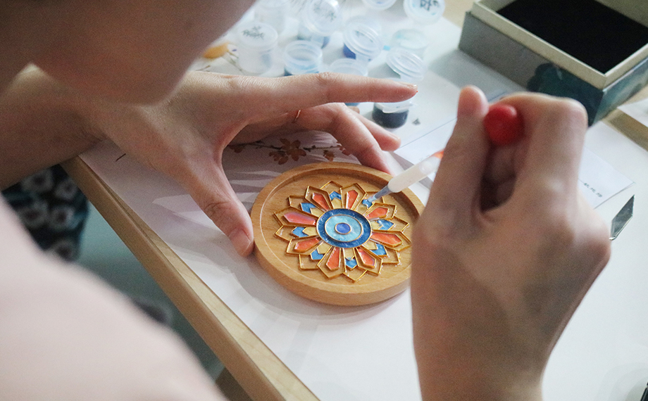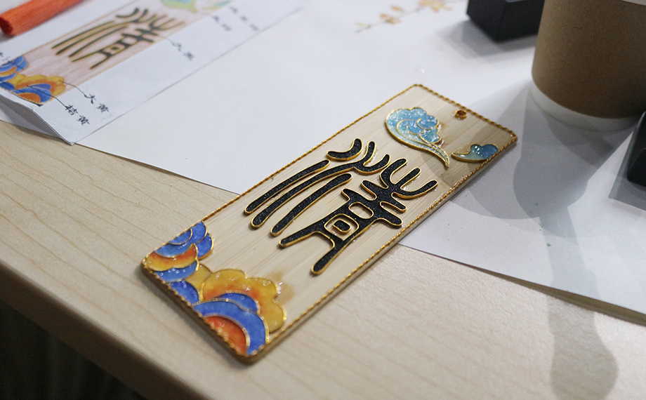 正是因?yàn)橐詼鬄榇淼牧汲純A力為民,社會(huì)才能進(jìn)步、時(shí)局才能穩(wěn)固,這也為乾隆時(shí)期景泰藍(lán)的復(fù)興創(chuàng)造了條件。景泰藍(lán),即掐絲琺瑯工藝,是中國的著名特種金屬工藝品類之一。在隨后的文化體驗(yàn)課環(huán)節(jié),大家興致勃勃地在老師的講解和幫助下參與到景泰藍(lán)手工技藝的體驗(yàn)活動(dòng)中,以金絲作胎,填充色釉,制作出屬于自己的景泰藍(lán)工藝蓮花杯墊、書簽、小鏡,用蓮心現(xiàn)廉韻,感受傳統(tǒng)文化魅力。