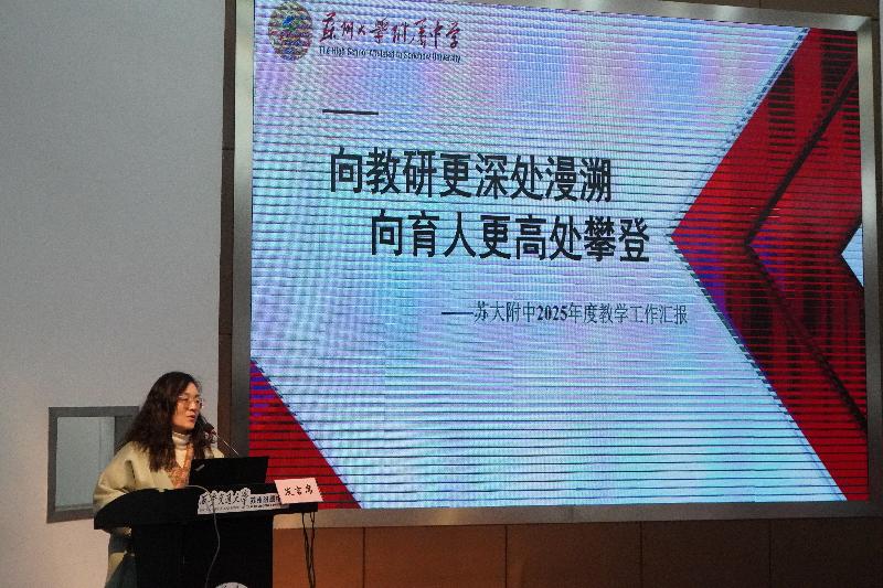 蘇州大學附屬中學教務處主任樊曉宇交流了“教學考評研”一體化探索的經驗。她展示了學校“以賽促教”取得的優異成績,并分享了“半塘書院”賦能教師專業成長、兩校區聯動深化集體備課、AI技術輔助新教師培養等一系列創新實踐,生動呈現了“一校兩區”優勢互補、協同發展的新路徑。