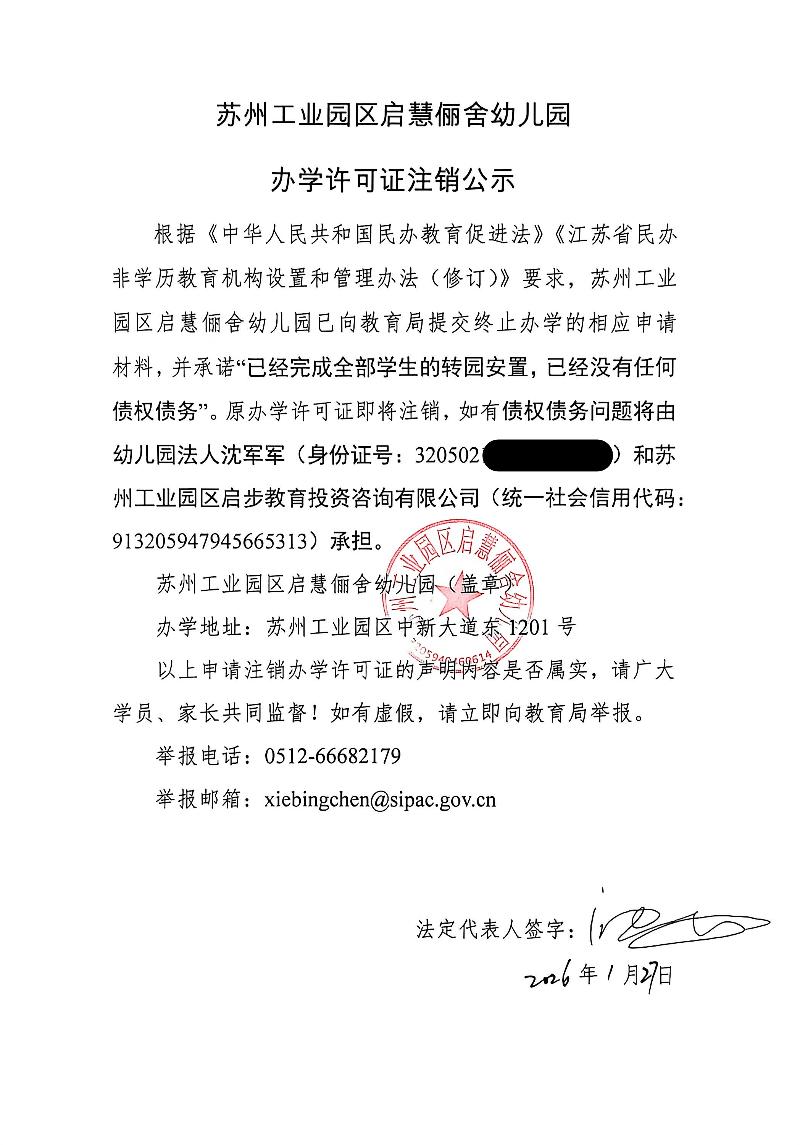 蘇州工業園區啟慧儷舍幼兒園辦學許可證注銷公示