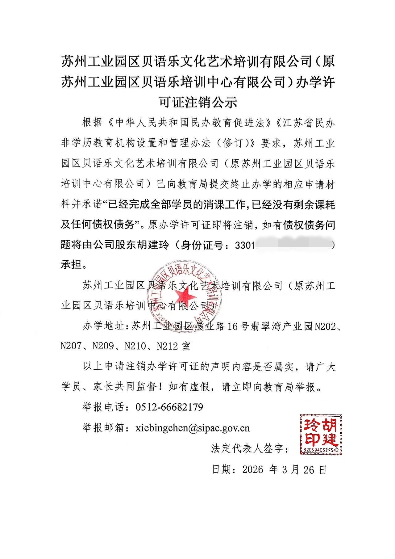 蘇州工業園區貝語樂培訓中心有限公司辦學許可證注銷公示